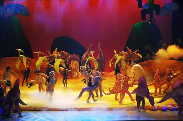 长着褐色小甲片的可爱桔色小甲龙、挥动着翅膀在高空飞舞的嫩绿的翼龙、有着紫色轻薄扇翼的扇龙、长着巨长的脖子身带小斑点的体型庞大的梁龙……与大家以往印象中绝然不同的恐龙们占满了整个舞台,完全颠覆了《侏罗纪公园》里让人印象深刻的冰冷残暴的恐龙形象。