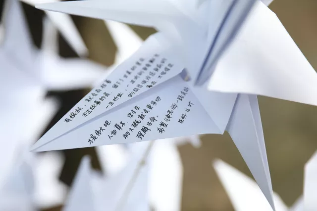 钟扬逝世后,复旦大学的学生们在千纸鹤上哀托寄语