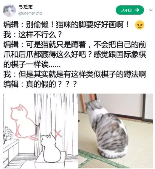 近日,岛国一位画猫咪漫画的猫奴推主うだま交稿时,被编辑要求好好画猫,理由是她画的猫太敷衍了,还被质问脚哪里去了...