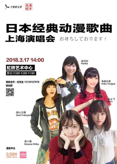 人气歌姬集结!福山沙織、柴小聖、ほのか、みゅう、鳥越衿香倾情加盟。2018年3月17日下午14点,上海虹桥艺术中心,日本经典动漫曲目重新演绎,曾经的旋律带来耳朵重新的体验。不能错过的音乐盛会,这是正经的预告o(*≧▽≦)ツ
