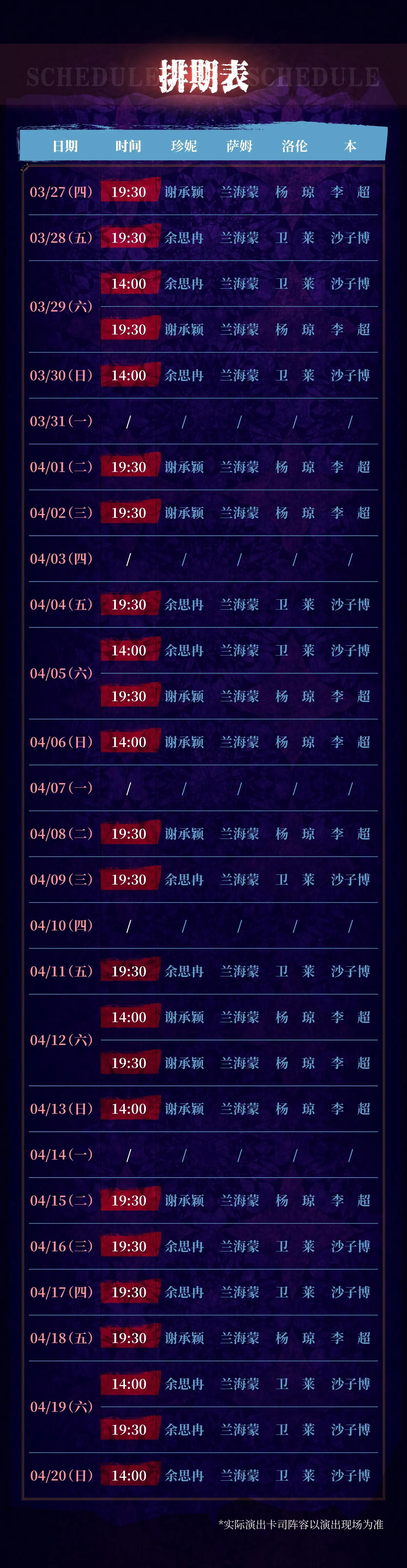 演出日期:2025年3月27日—2025年4月20日(每周一、4月3日及4月10日无演出,周六加演14:00下午场、周日仅14:00下午场)