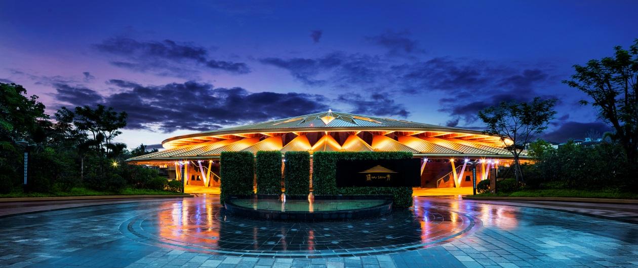 双层折叠式圆顶设计,以传统傣家文化中的金斗笠为原型建造,折叠斜屋顶设计灵感源于棕榈叶几何形状的艺术创意表现,同时又与当地傣族建筑的折叠斜顶风格呼应,大厅屋顶结构融入管状元素,是对传统傣族竹楼材质的现代解读,将艺术与文化的完 美融合。斥资超20亿,占地3.64公顷的傣秀剧院现已成为现代中国唯 一一座将傣族文化与高科技完 美融合的艺术堡垒。