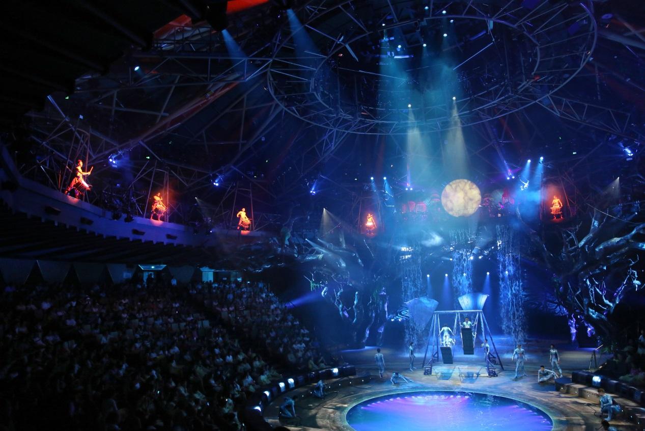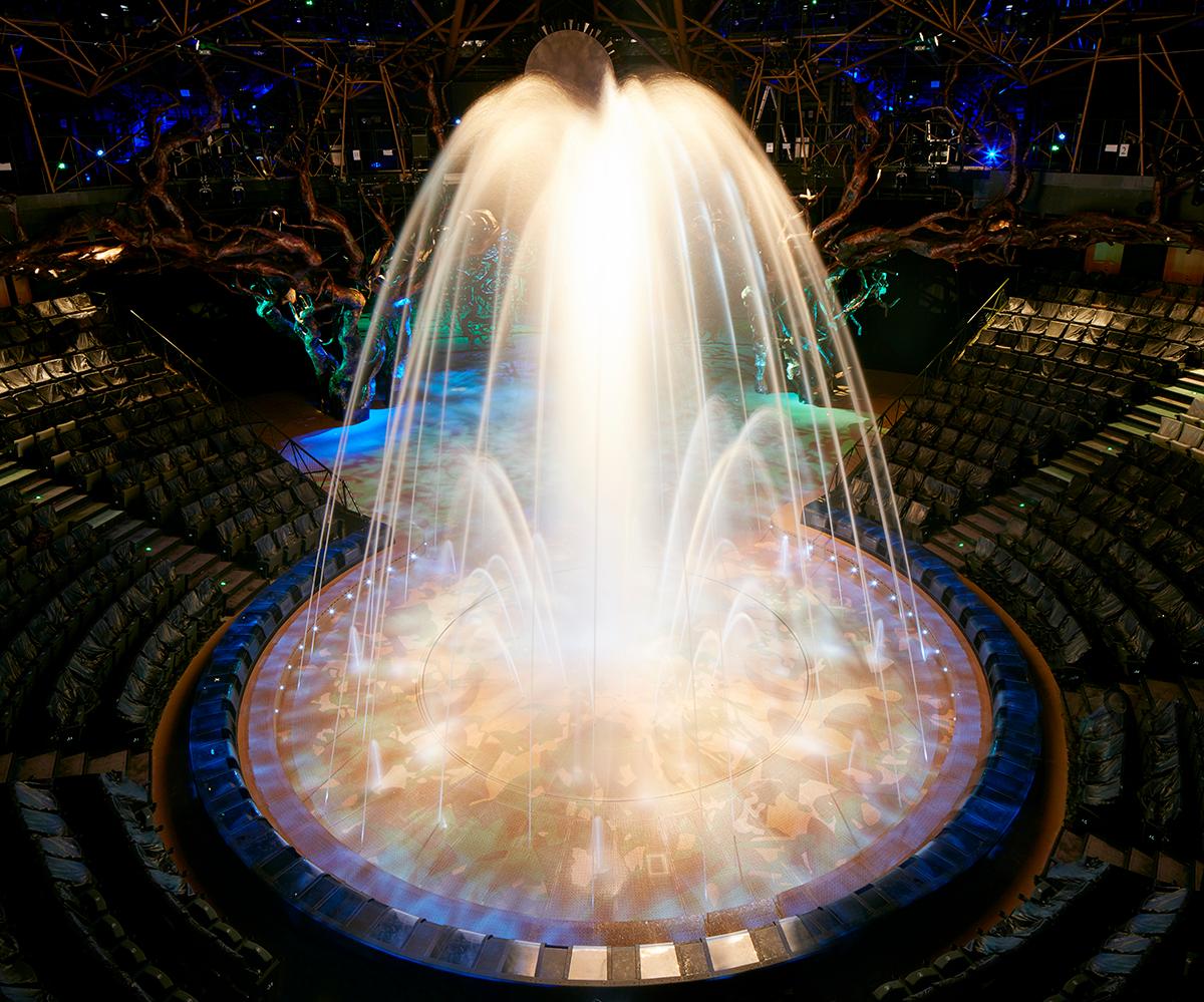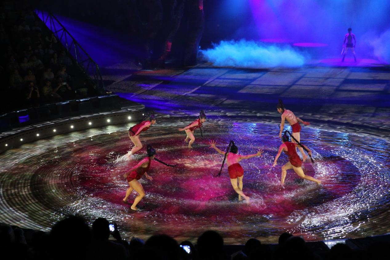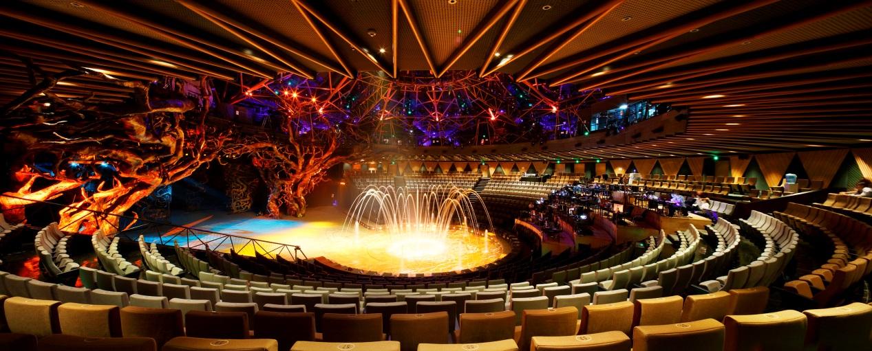 20亿打造6D水陆舞台,仅30秒就能完成干湿水陆舞台瞬间转换,国内首座立体3D空中飞行技术,精准计算的飞行路线,体验现场立体魔幻3D飞行的超刺激视感。1400立方米的中央升降台,数百个世界 级扬声器,立体式环音系统,104个分布于全剧场的立体水特效装置,270度广角观演体验水陆自由转换的水处理控制系统,尖 端科技的凝聚,让这场盛宴如虎添翼。