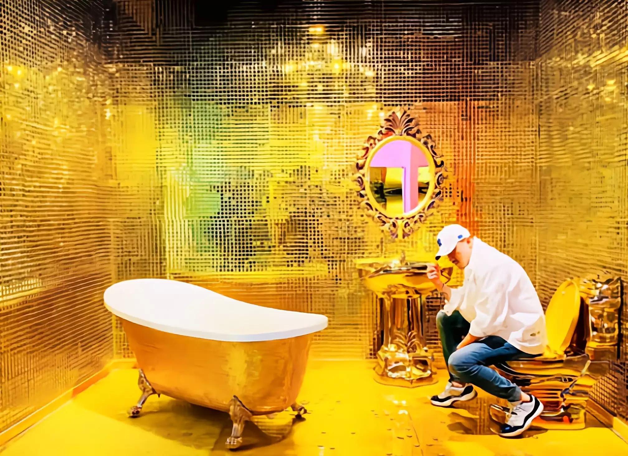 金浴缸、黄金马桶、黄金台盒盆、黄金镜再来洗一个