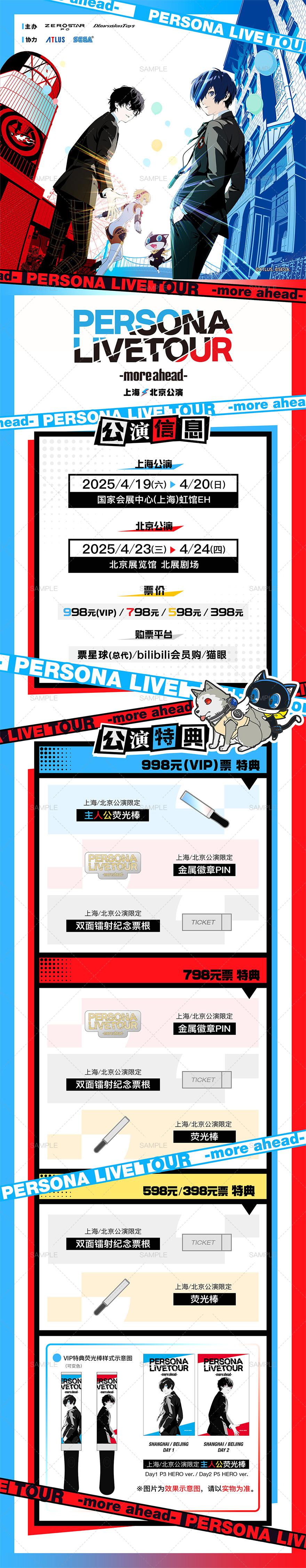 ■本次上海/北京公演限定特典:其中998元(VIP)票赠送「上海/北京公演限定主人公荧光棒」「金属徽章PIN」「双面镭射纪念票根」;798元票档赠送「金属徽章PIN」「双面镭射纪念票根」「上海/北京公演限定荧光棒」;598元/398元票赠送「双面镭射纪念票根」「上海/北京公演限定荧光棒」。