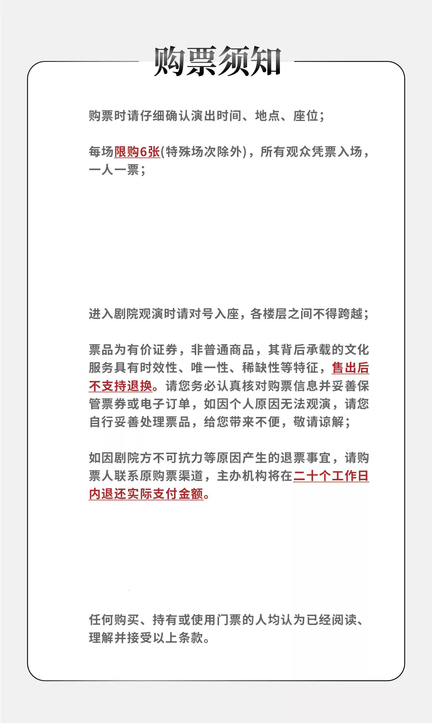 | 限购说明 | 每单限购6张 | 重复购票说明 | 同一位“实名观演人”请勿在多个售票平台重复购票,一位“实名观演人”的身份信息对应同场次的一张门票。 若同一位“实名观演人”被发现存在多个购票平台购买同场次行为,由该行为产生的无效重复订单、退票手续费、过期不可退票、无法入场等所有损失,均由购票人自行承担。 |