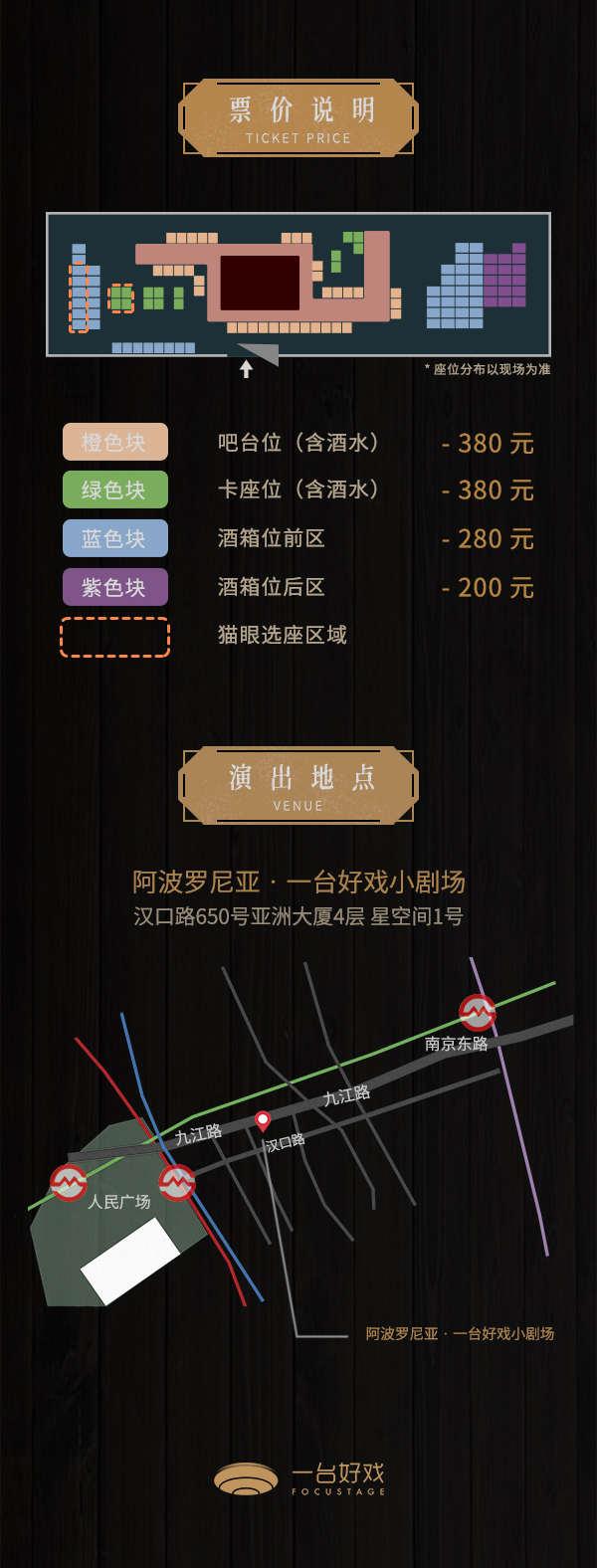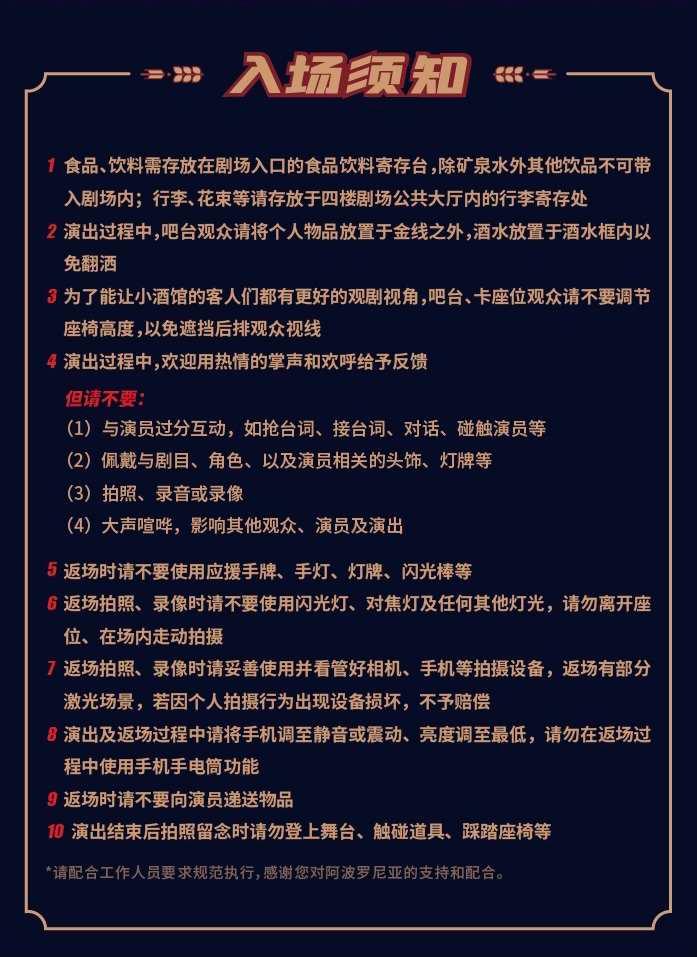 2.本剧设有迟到点,迟到或演出期间离场的观众需在场外等候可入场通知,请合理安排您的出行时间谨防迟到!