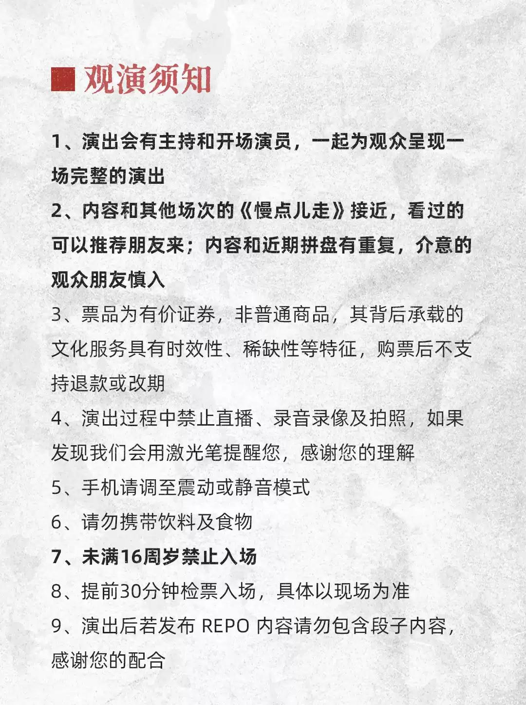 | 温馨提示 | 购买前请您提前规划好行程,做好相应准备,以免影响您的正常观演,感谢您的理解和配合。 若演出受不可抗力影响延期或取消,票牛将对演出票订单按照项目官方通知方案进行处理,其他因观演发生的费用需由您自行承担。 | 实体票 | 本项目支持凭实体票入场,支持以下取票方式: - 快递配送:运费10元(V4及以上会员包邮),顺丰发货。 - 现场取票:票牛工作人员将在演出开场前1小时至现场派票。工作人员联系方式、具体取票地点将在演出当天以短信通知发送至预留的手机号。 |