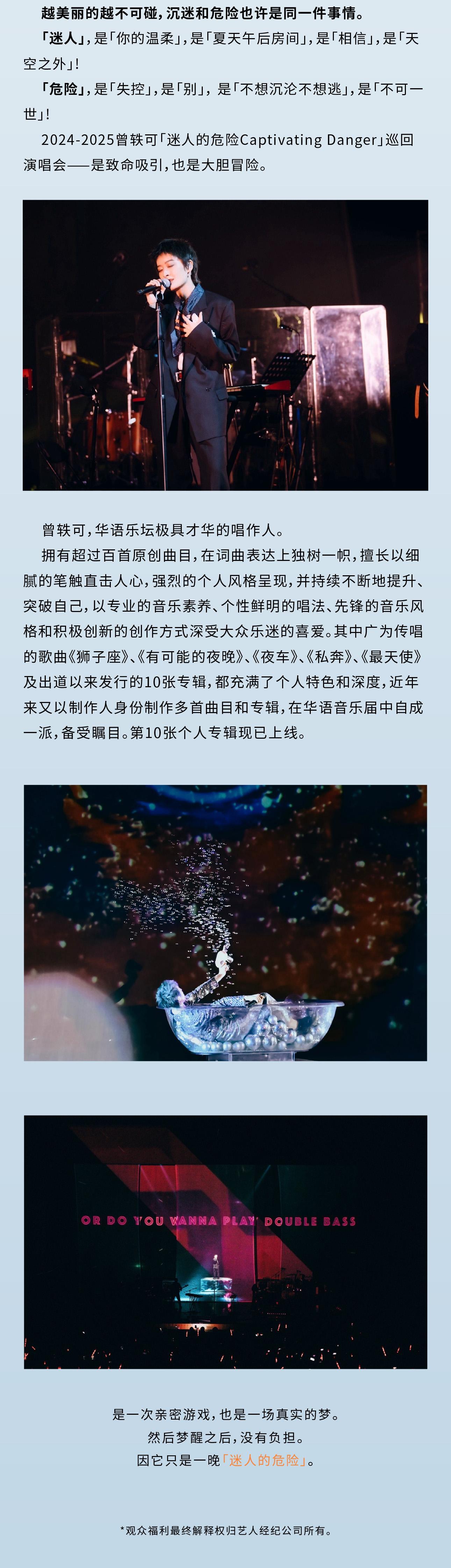 | 限购说明 | 每单限购6张 | 重复购票说明 | 同一位“实名观演人”请勿在多个售票平台重复购票,一位“实名观演人”的身份信息对应同场次的一张门票。 若同一位“实名观演人”被发现存在多个购票平台购买同场次行为,由该行为产生的无效重复订单、退票手续费、过期不可退票、无法入场等所有损失,均由购票人自行承担。 |