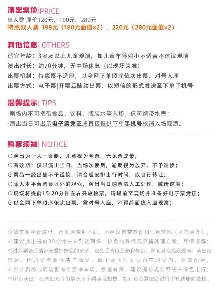 | 电子票 | 本项目支持凭电子票入场。 -请至少提前一天购买,开演前24小时内,票牛会发送取票短信,请按短信提示内容取票。 |