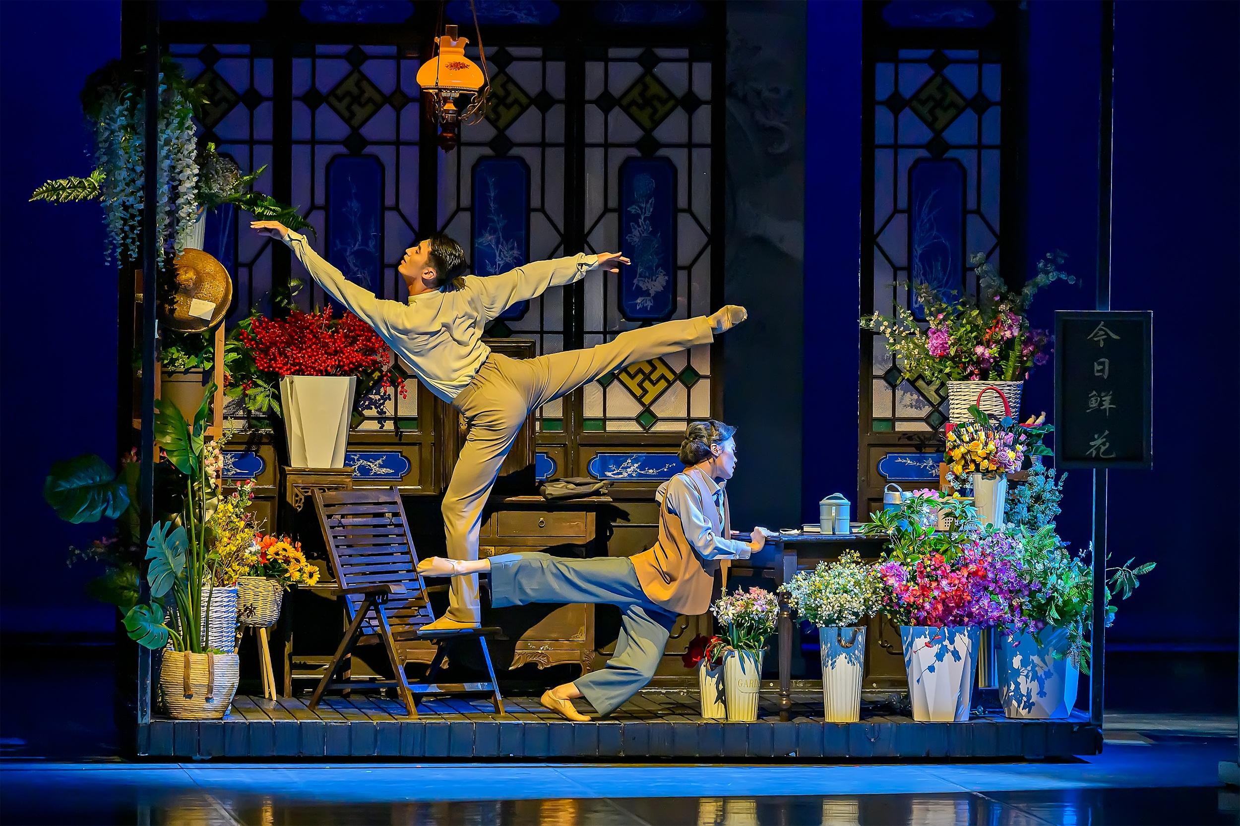 舞剧《人在花间住》便以“花”为背景和叙述线条:聚焦骑楼下一间花店里的平凡母子,在“花”的指引下,共同面对生活的磨砺,重新认识彼此。剧中,灿烂盛开的鲜花变成生命的象征、情感的媒介,岭南老街巷的世俗人情,寻常百姓家的生活绘卷,一对母子间的细腻情感,因为花的链接,而有了别样风景。