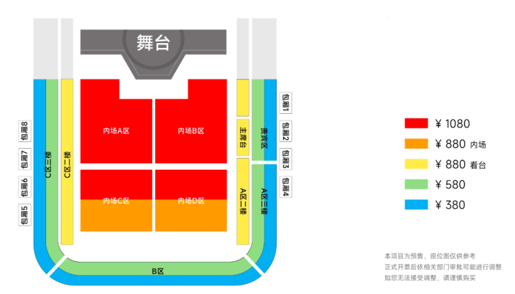 | 服务费说明 | 为了给您提供便利的在线购票服务,票牛为此投入大量的平台技术支持、运营维护支持,并联合平台入驻商家、第三方在线支付服务商、第三方合作商等合作方为您提供服务,基于前述平台成本及合作方服务费用,票牛向您收取不超过票款5%的平台服务费(最高不超过400元)。 票牛收取的平台服务费,主要可能包括如下内容:1.票牛的线上平台和软件系统开发维护成本。2.支付宝、微信等第三方支付服务商收取的支付手续费用。3.物流公司收取的票品寄送费用(如纸质票)。4.客户服务成本以及短信、电话等通道费用。5.为用户提供购票保障服务对应的运营与管理成本。6.其它为完成用户订单必须的相关服务成本、人员成本等。 | 座位类型 | 请按门票对应座位,有序对号入座 |