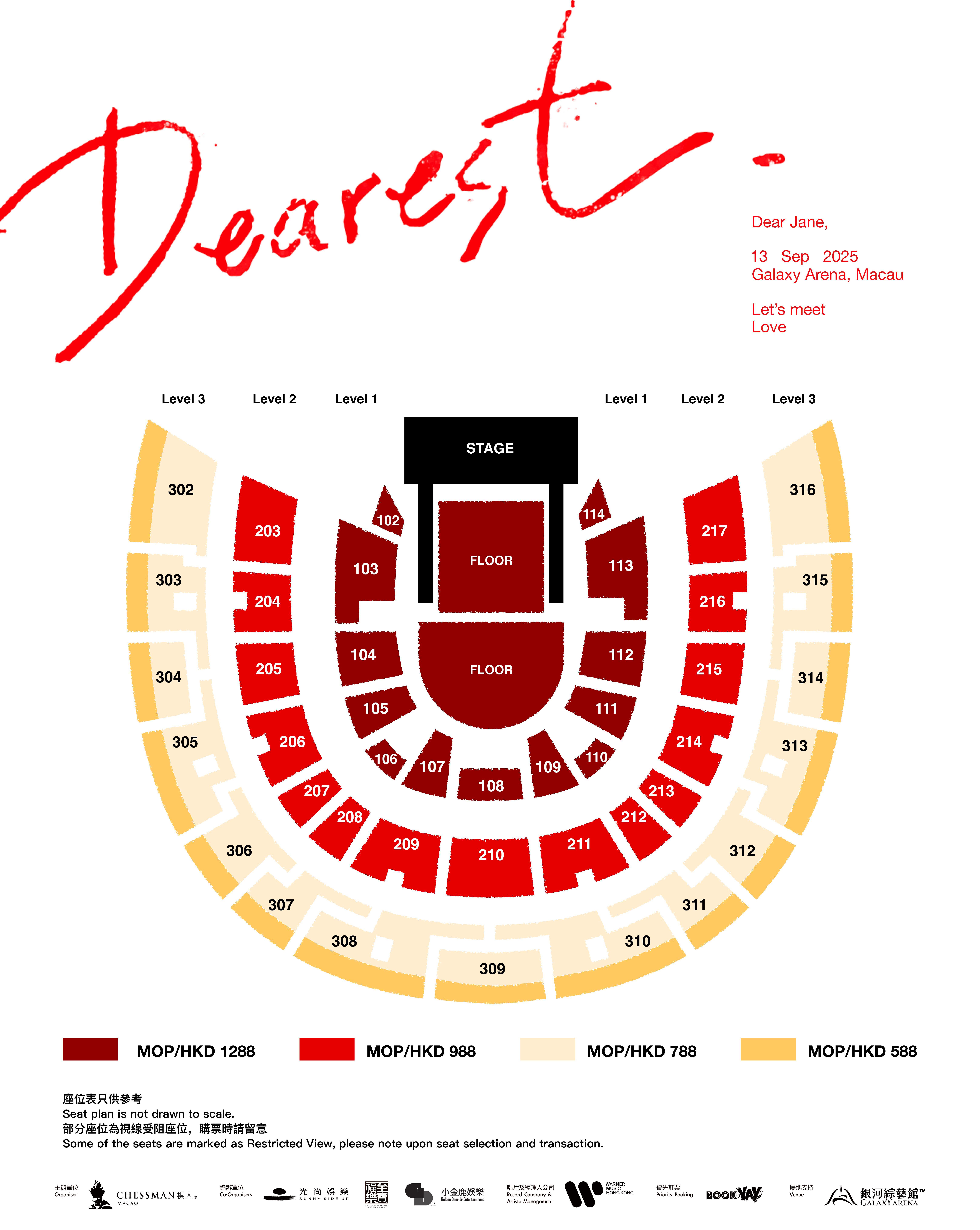 澳门币票价MOP:1,288 / 988 / 788 / 588