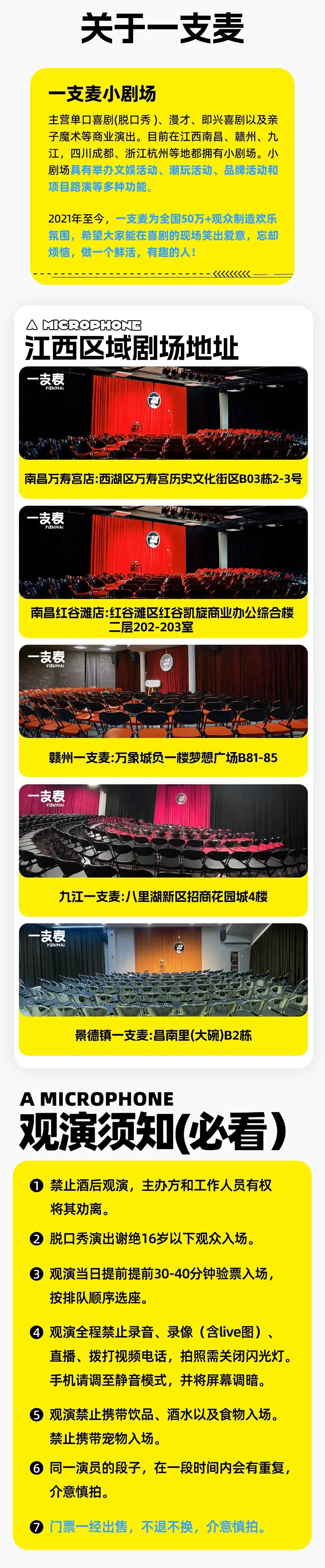 | 儿童入场提示 | 脱口秀演出谢绝16岁以下观众入场 | 禁止携带物品 | 食品、饮料、相机、充电宝、打火机等 |