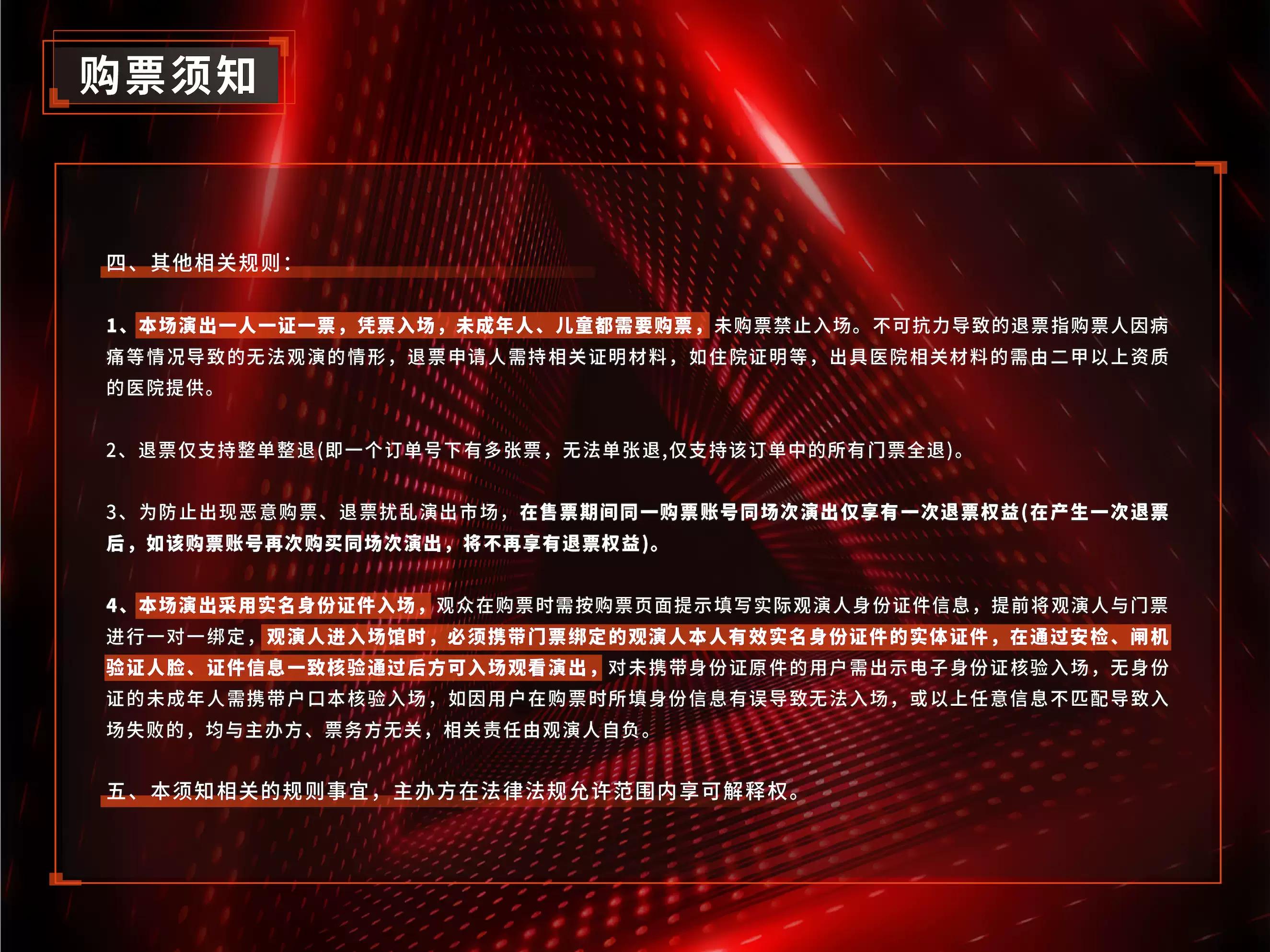 | 限购说明 | 每单限购6张 | 重复购票说明 | 同一位“实名观演人”请勿在多个售票平台重复购票,一位“实名观演人”的身份信息对应同场次的一张门票。 若同一位“实名观演人”被发现存在多个购票平台购买同场次行为,由该行为产生的无效重复订单、退票手续费、过期不可退票、无法入场等所有损失,均由购票人自行承担。 |