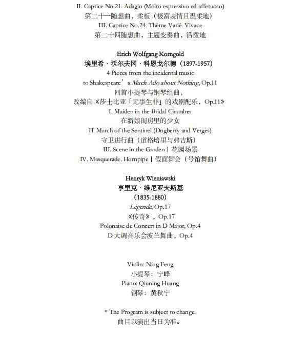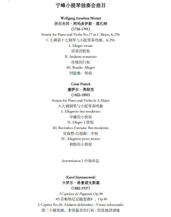 宁峰演奏的是一把由飞跃演奏香港有限公司提供的1710年斯特拉迪瓦里小提琴“维厄当”,他所使用的琴弦由维也纳Thomastik-Infeld工作室制作。