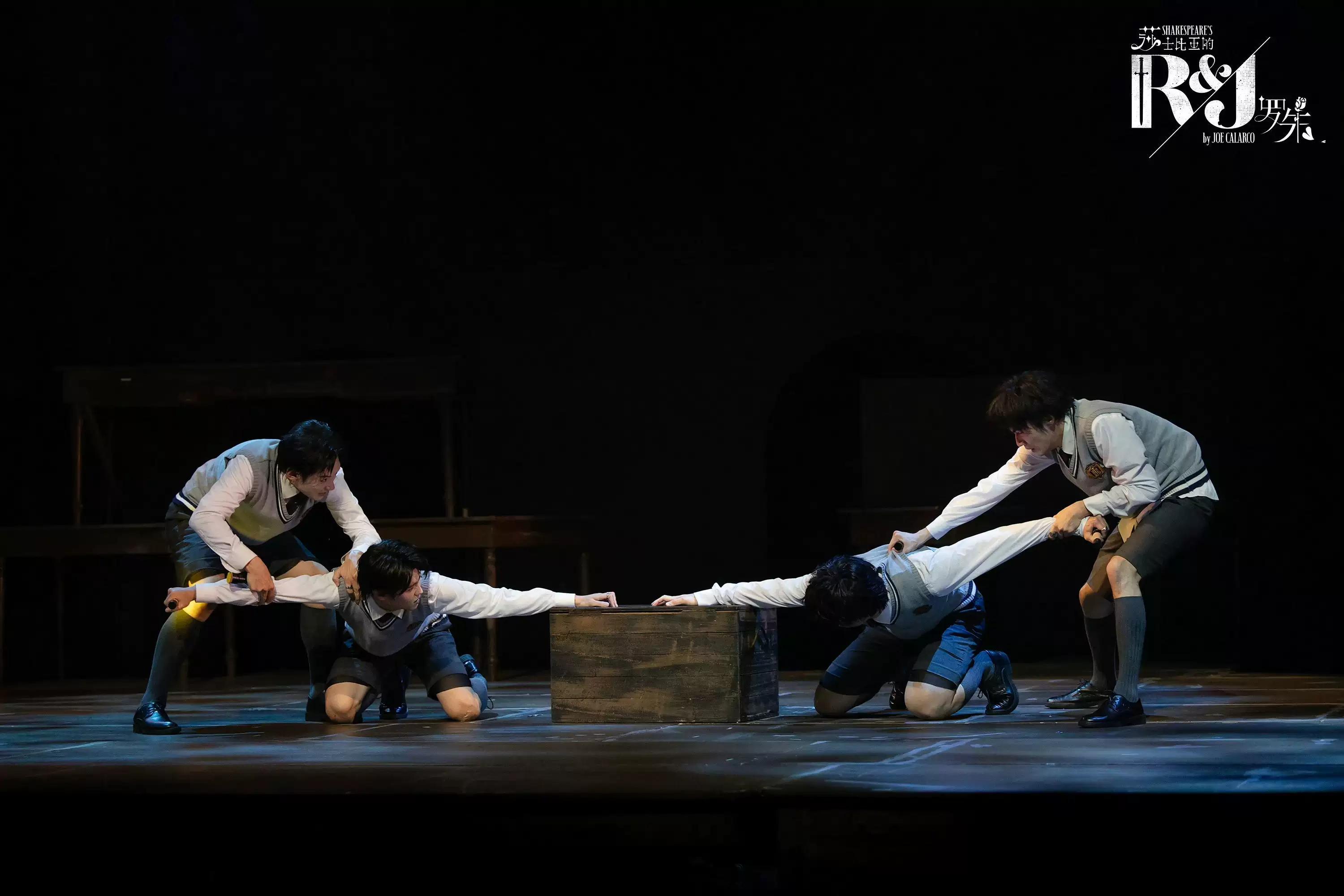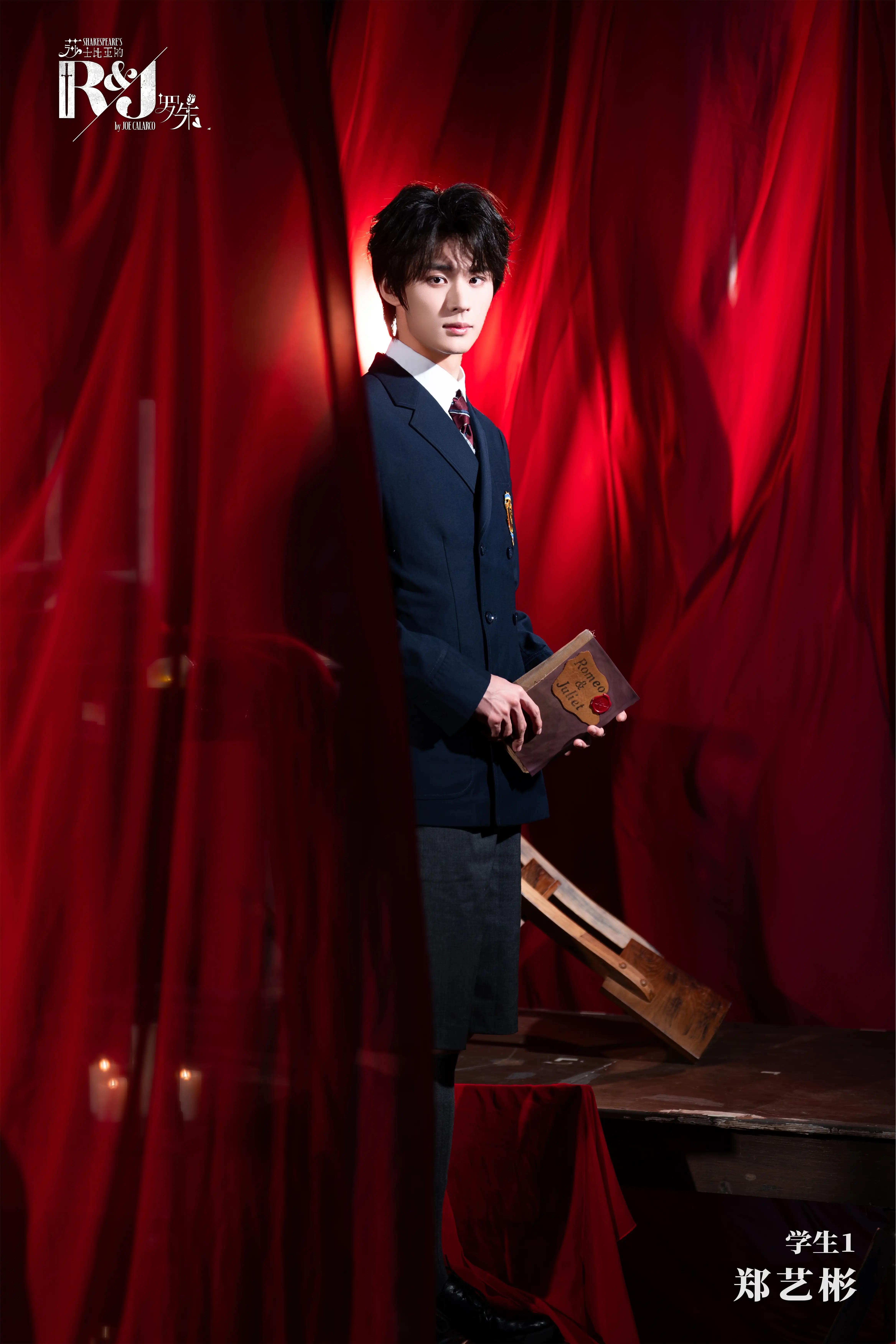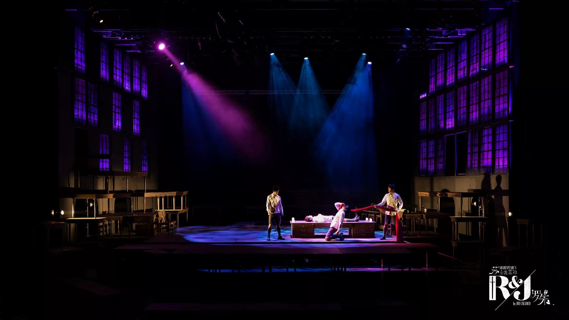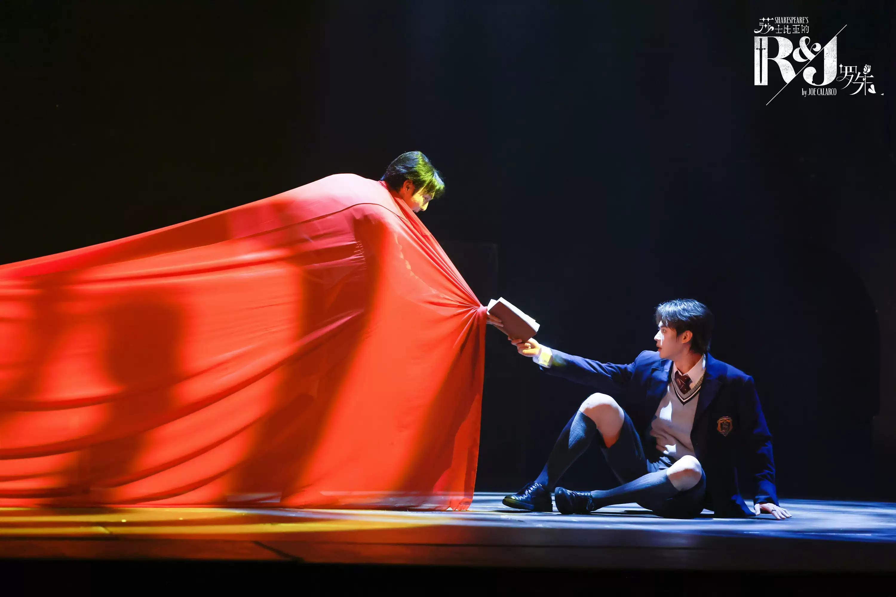 本剧布景极简,以课桌椅装置舞台,只凭一块红布作为角色辗转腾挪的唯 一道具。它是蒙太古的披风,凯普莱特的长裙,茂丘西奥的血,劳伦斯神父的毒。尽可能地简化舞台,就尽可能地留下了想象的空间。