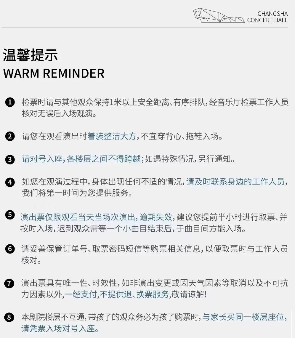 - 1.购买前请您提前规划好行程,做好相应准备,以免影响您的正常观演,感谢您的理解和配合。2.若演出受不可抗力影响延期或取消,大麦将对演出票订单按照项目官方通知方案进行处理,其他因观演发生的费用需由您自行承担。