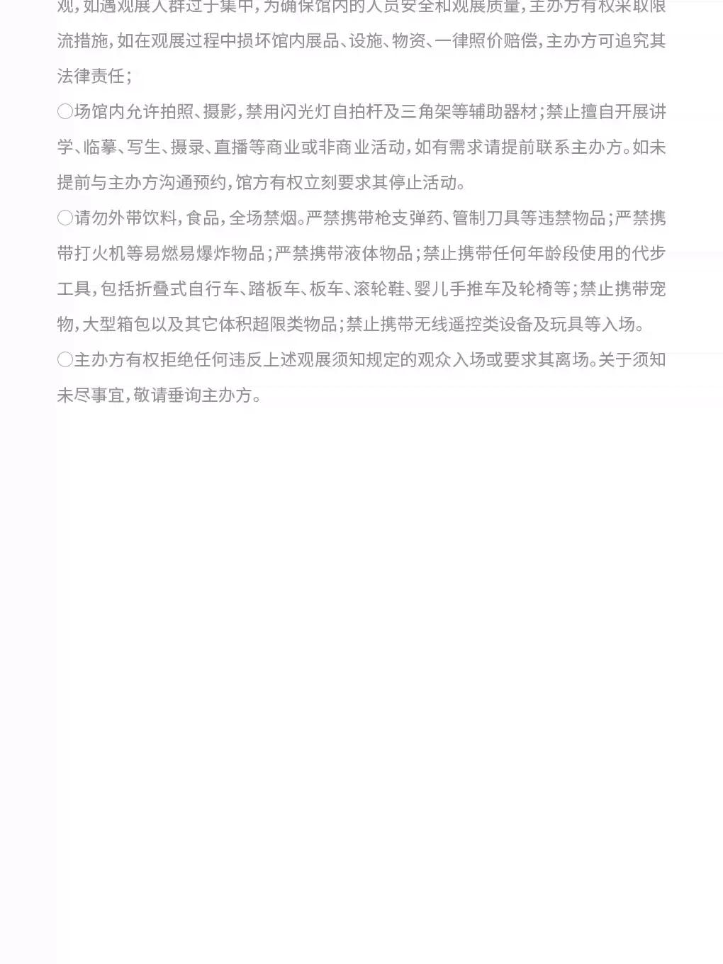 | 儿童入场提示 | 6周岁或1.2米以下儿童免票,需家长陪同(家长需购票,每个家长至多能带两名儿童) | 禁止携带物品 | 食品、饮料、相机、充电宝、打火机等 |