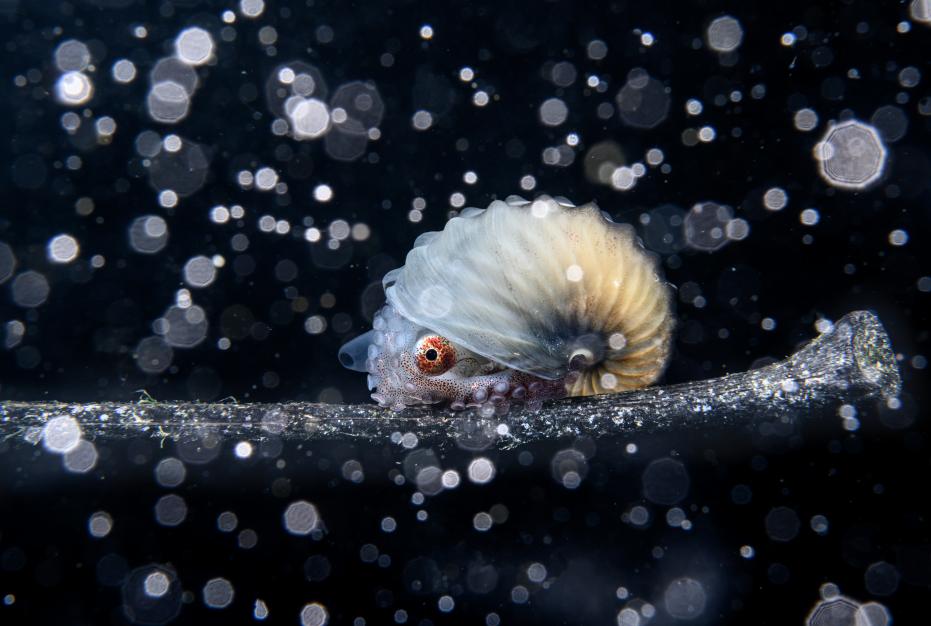 摄2020年初,菲律宾塔阿尔火山喷发后,海底沉积物被搅动,在能见度极 低的海中,这些悬浮物并没有展现出自然灾害后的混乱,而是唤起了一种不同寻常的宁静感,转变成一个雪夜童话的场景。一只趴在漂浮树枝上的雌性船艄,分泌出一层纸一样薄的壳,用于产卵,周围的悬浮颗粒折射了闪光灯,创造出落雪的幻觉。