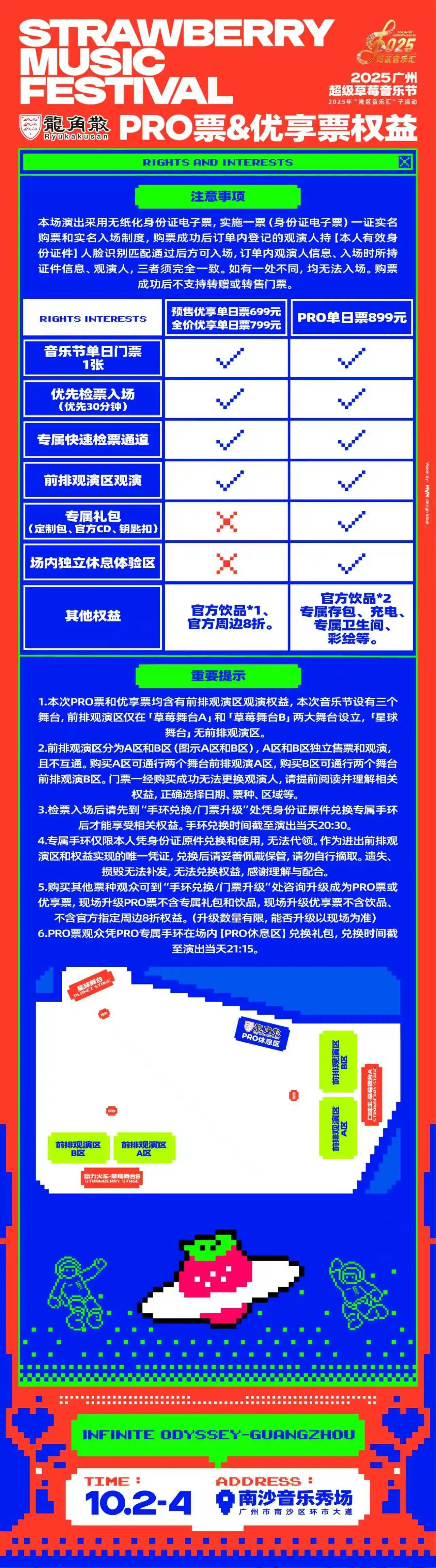 PRO单日票899元:含音乐节单日票门票1张,以及专属礼包、专属权益。(专属礼包:PRO定制包 ×1、随机官方CD ×1、PRO定制钥匙扣×1;专属权益:两个草莓舞台前排观演;独立休息区;专属快速检票通道;优先30分钟检票入场;官方指定饮品×2;专属存包处;独立卫生间;充电处;彩绘区。)