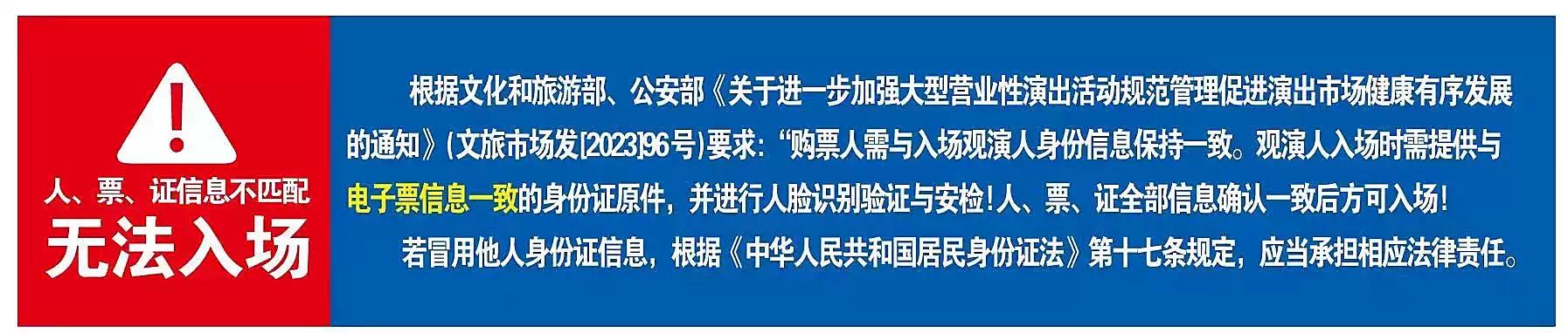 | 限购说明 | 每单限购6张 | 重复购票说明 | 同一位“实名观演人”请勿在多个售票平台重复购票,一位“实名观演人”的身份信息对应同场次的一张门票。 若同一位“实名观演人”被发现存在多个购票平台购买同场次行为,由该行为产生的无效重复订单、退票手续费、过期不可退票、无法入场等所有损失,均由购票人自行承担。 |