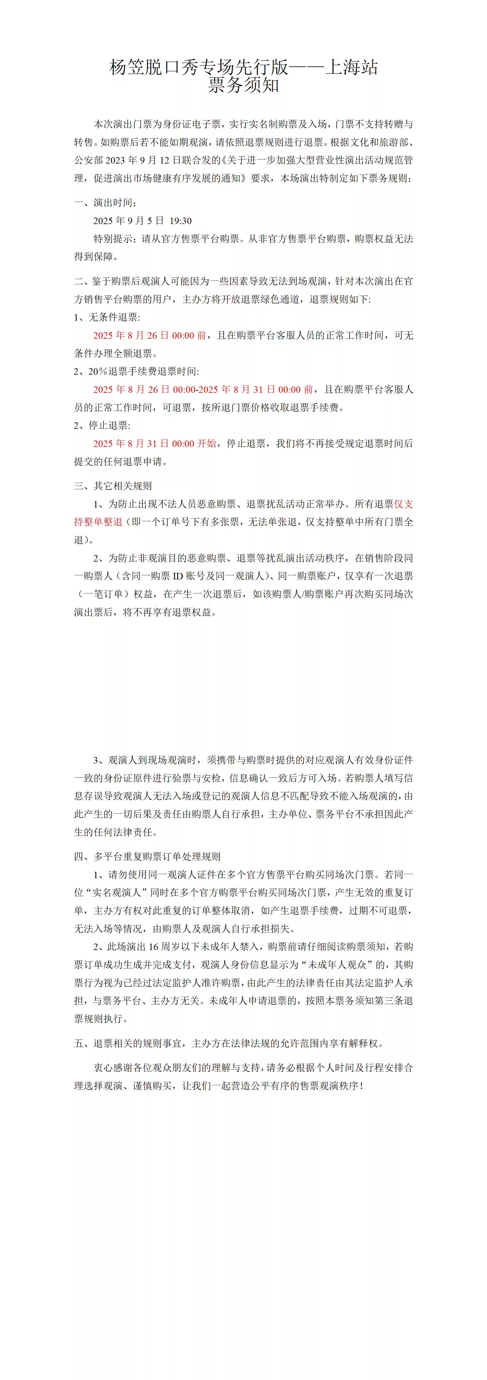 因版权保护需要,全场禁止录音、录像、直播。现对观众携带物品的禁止及限制条款说明如下:
