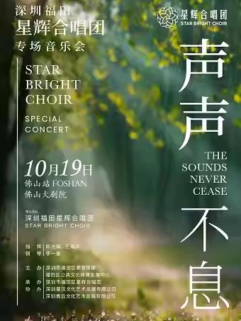 演出名称:“声声不息”深圳福田星辉合唱团2025大湾区巡演佛山专场音乐会演出时间:2025年10月19日(周日)19:30