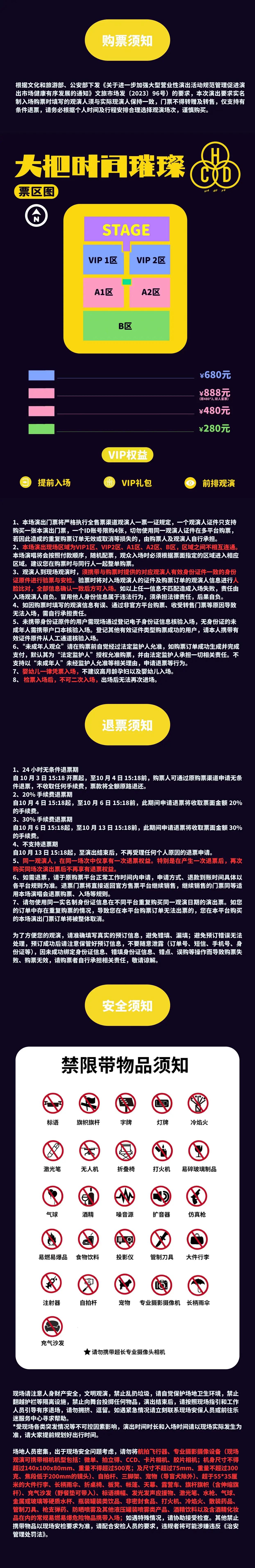 | 限购说明 | 每单限购6张 | 重复购票说明 | 同一位“实名观演人”请勿在多个售票平台重复购票,一位“实名观演人”的身份信息对应同场次的一张门票。 若同一位“实名观演人”被发现存在多个购票平台购买同场次行为,由该行为产生的无效重复订单、退票手续费、过期不可退票、无法入场等所有损失,均由购票人自行承担。 |
