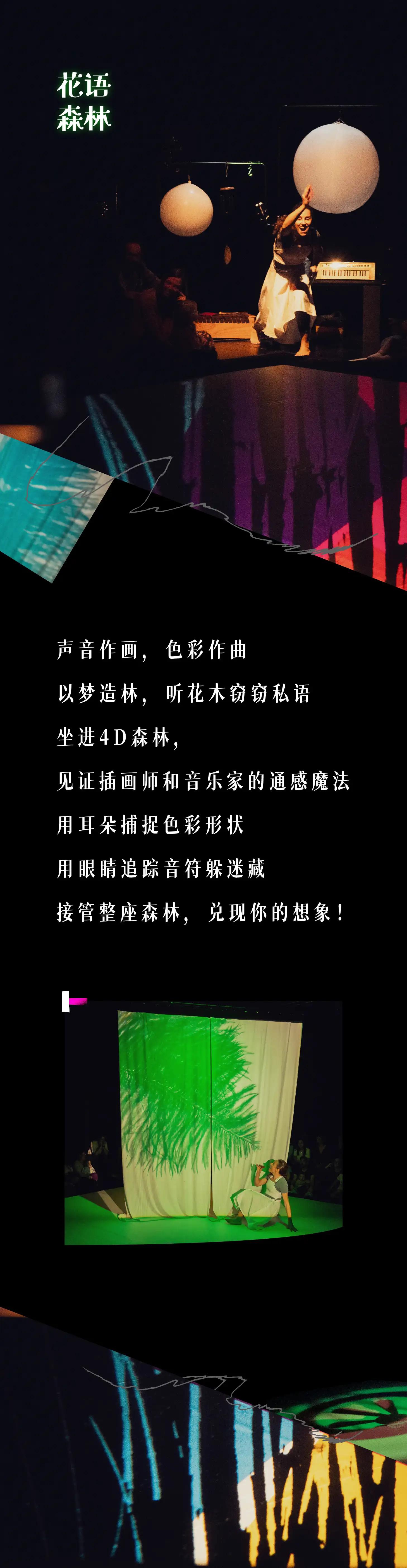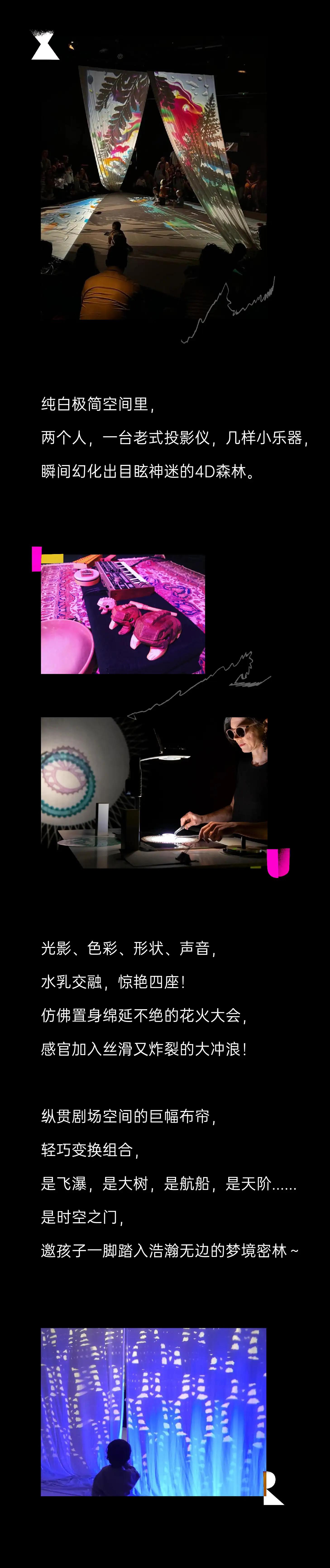 4D森林秘境:极简空间内,通过光影、声音、织物与投影,构建可触摸的奇幻森林。