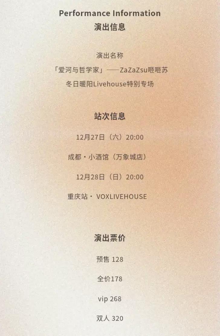 | 发票说明 | 如需开具发票,请在演出结束后一个月内联系客服并提供开票信息:票款发票由商家开具,平台服务费发票由票牛开具。 | 重要提示 | 演出现场气氛热烈,请您务必根据自身身体状况酌情是否购票参与观演,特别是患有心脏类疾病、急性心脑血管疾病、心肌炎、高血压等相关疾病的人群,请您务必遵照医嘱,结合病史及个人身体状况进行观演,观演期间请自行承担身体健康相关责任。 |