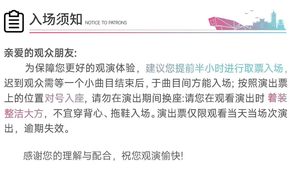 | 重要提示 | 演出现场气氛热烈,请您务必根据自身身体状况酌情是否购票参与观演,特别是患有心脏类疾病、急性心脑血管疾病、心肌炎、高血压等相关疾病的人群,请您务必遵照医嘱,结合病史及个人身体状况进行观演,观演期间请自行承担身体健康相关责任。 | 温馨提示 | 购买前请您提前规划好行程,做好相应准备,以免影响您的正常观演,感谢您的理解和配合。 若演出受不可抗力影响延期或取消,票牛将对演出票订单按照项目官方通知方案进行处理,其他因观演发生的费用需由您自行承担。 |