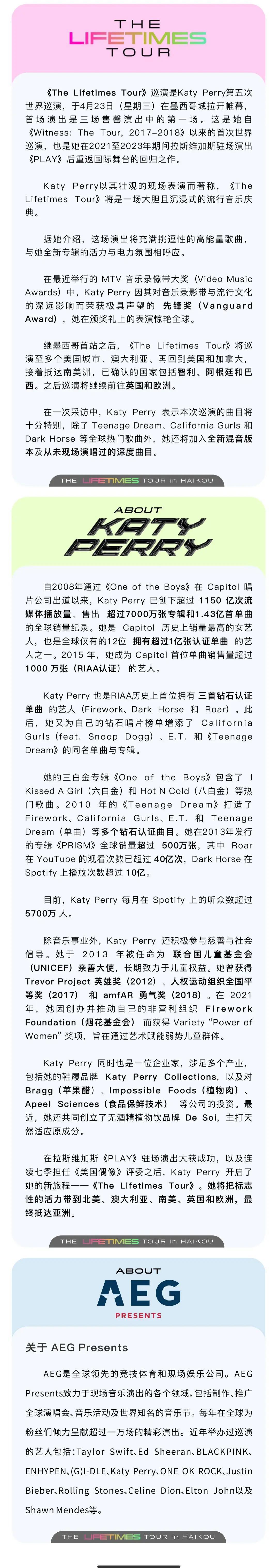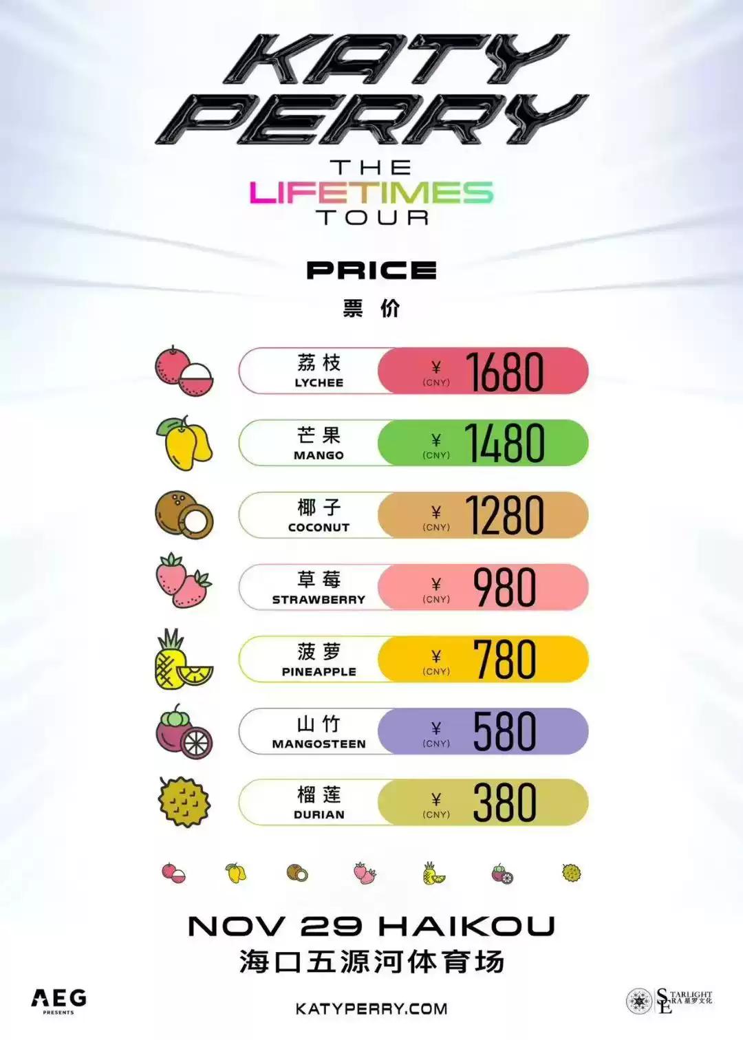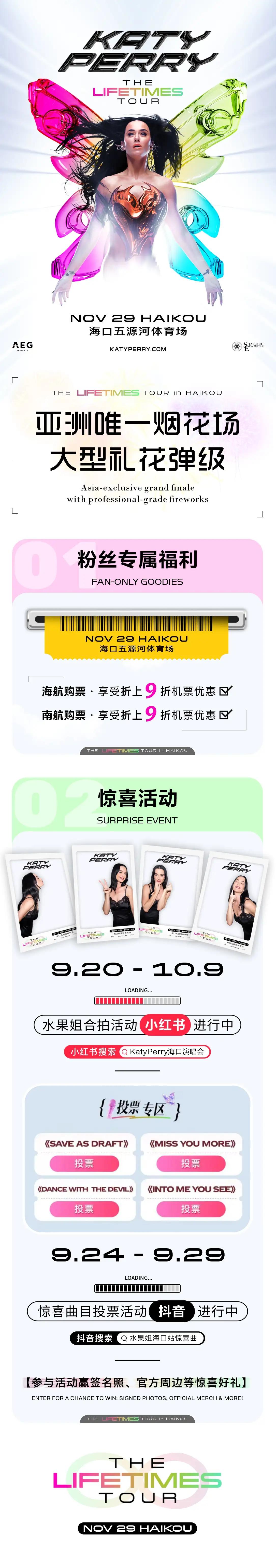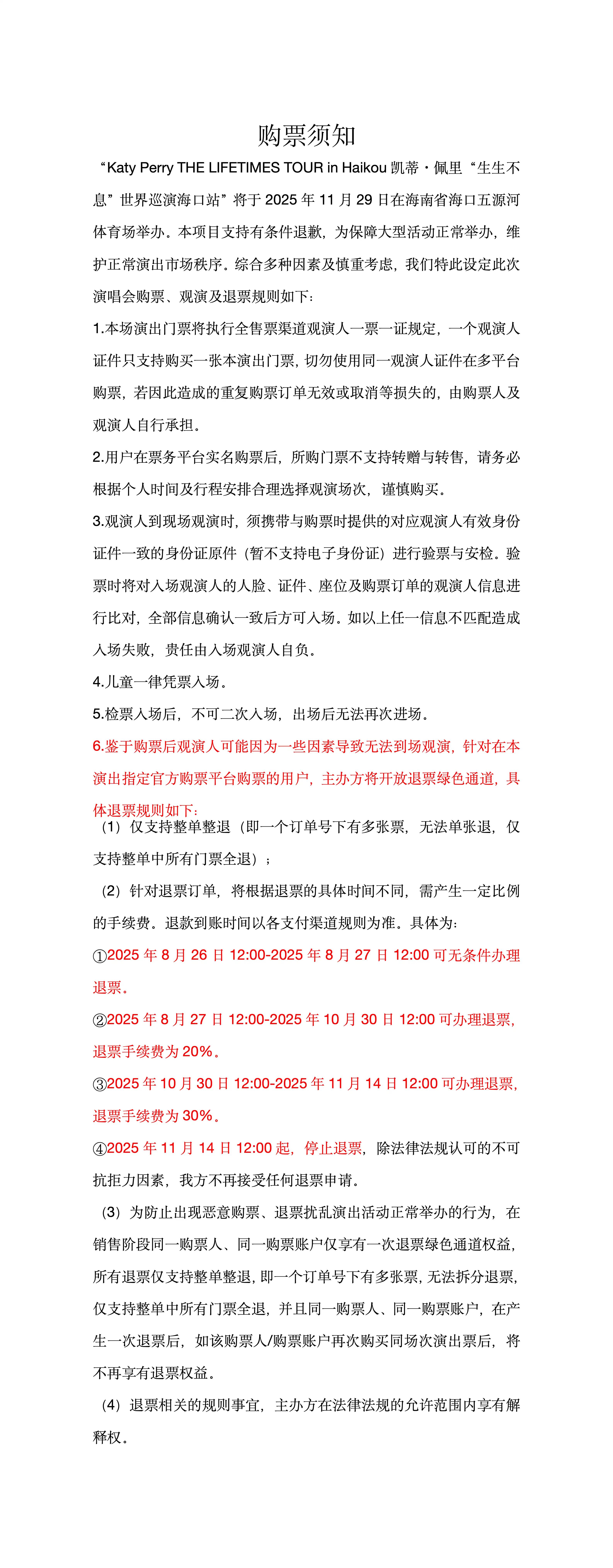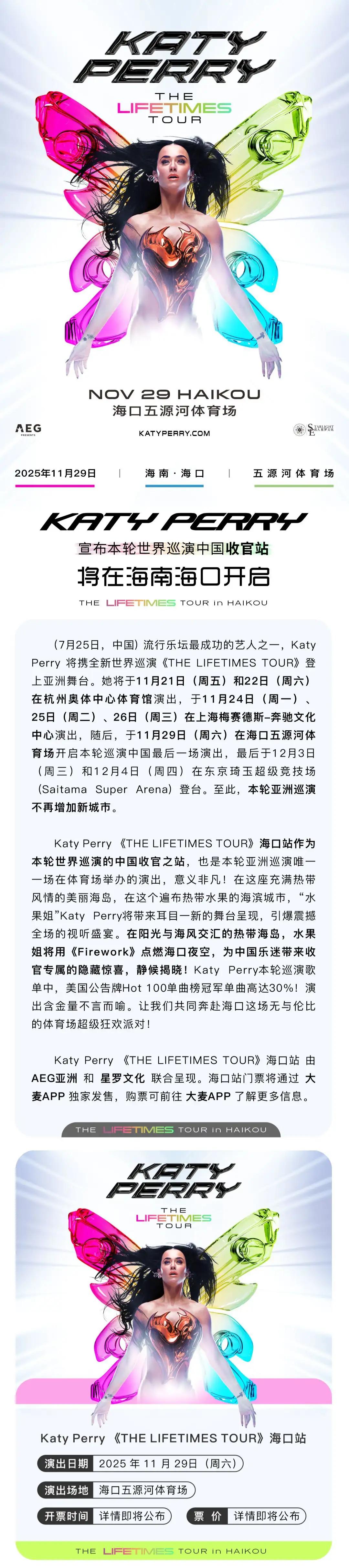 Katy Perry THE LIFETIMES TOUR in Haikou 凯蒂·佩里“生生不息”世界巡演海口站于2025年9月28日14:30分在官方购票平台对退票窗口产生的少量退票进行再次公开销售。再次售票的退票规则延用预售的退票规则,此次门票售出无免费退票期,请谨慎下单!本场演出为实名制观演,禁止转赠,请广大歌迷及消费者谨慎购票,以免给您带来不便及损失。