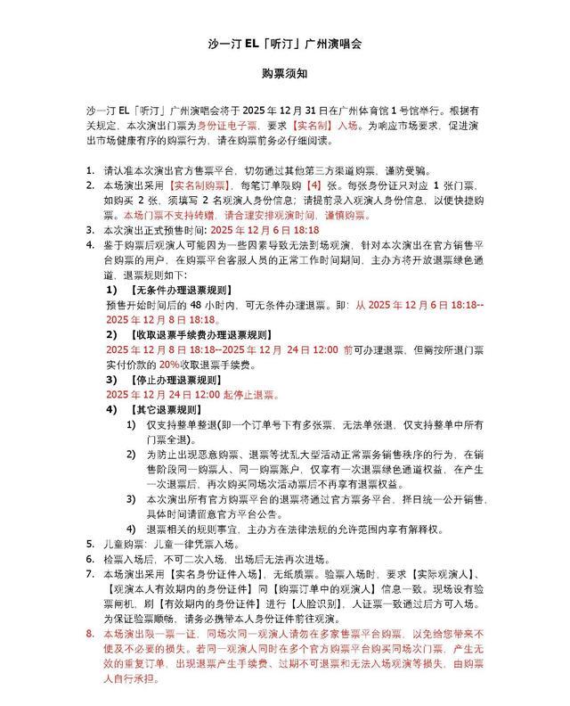 | 限购说明 | 每单限购6张 | 重复购票说明 | 同一位“实名观演人”请勿在多个售票平台重复购票,一位“实名观演人”的身份信息对应同场次的一张门票。 若同一位“实名观演人”被发现存在多个购票平台购买同场次行为,由该行为产生的无效重复订单、退票手续费、过期不可退票、无法入场等所有损失,均由购票人自行承担。 |