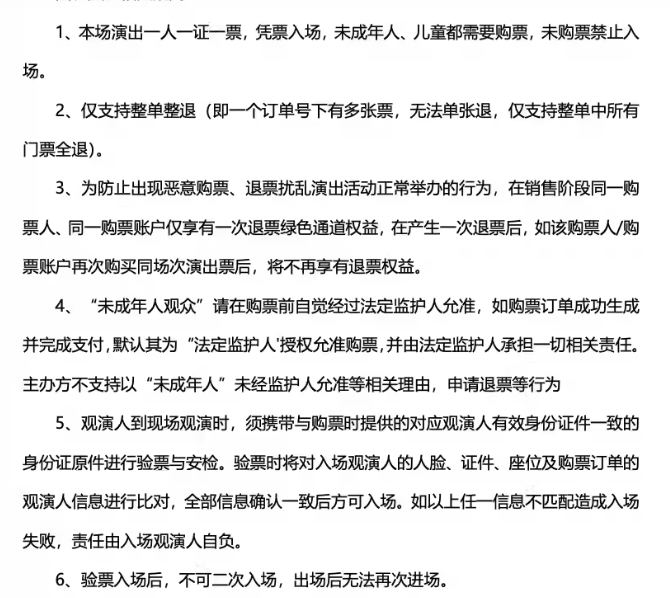 | 限购说明 | 每单限购6张 | 重复购票说明 | 同一位“实名观演人”请勿在多个售票平台重复购票,一位“实名观演人”的身份信息对应同场次的一张门票。 若同一位“实名观演人”被发现存在多个购票平台购买同场次行为,由该行为产生的无效重复订单、退票手续费、过期不可退票、无法入场等所有损失,均由购票人自行承担。 |