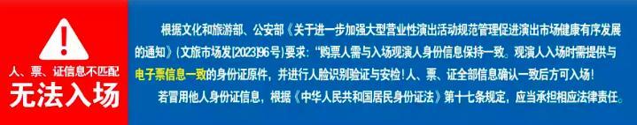 | 温馨提示 | 购买前请您提前规划好行程,做好相应准备,以免影响您的正常观演,感谢您的理解和配合。 若演出受不可抗力影响延期或取消,票牛将对演出票订单按照项目官方通知方案进行处理,其他因观演发生的费用需由您自行承担。 | 电子票 | 本项目支持凭电子票入场。 -请至少提前一天购买,开演前24小时内,票牛会发送取票短信,请按短信提示内容取票。 |