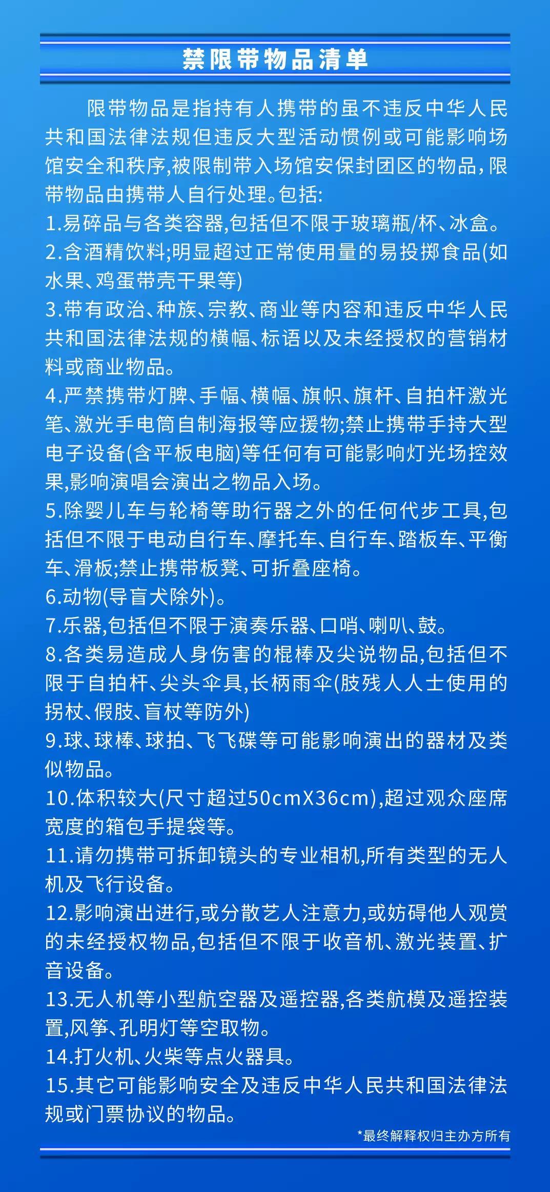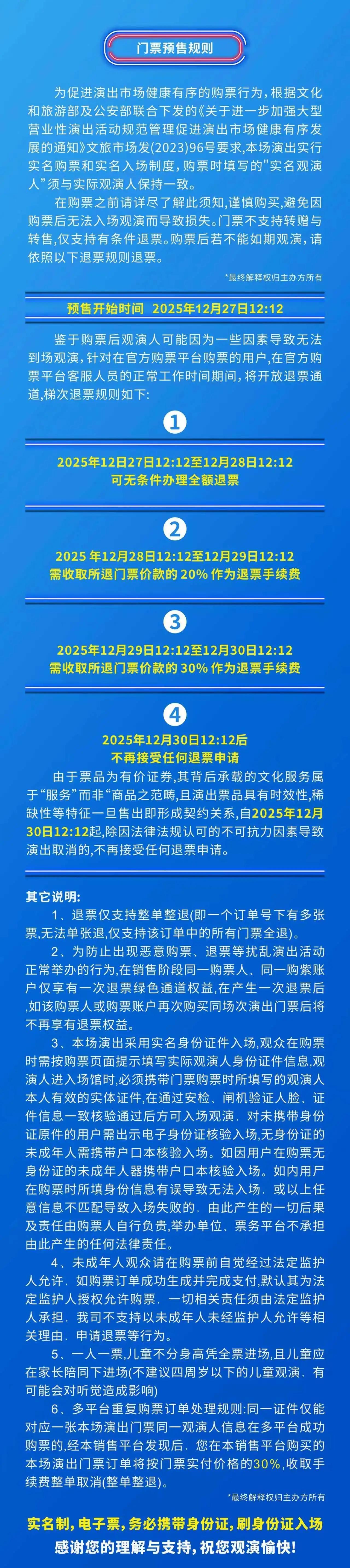 | 限购说明 | 每单限购6张 | 重复购票说明 | 同一位“实名观演人”请勿在多个售票平台重复购票,一位“实名观演人”的身份信息对应同场次的一张门票。 若同一位“实名观演人”被发现存在多个购票平台购买同场次行为,由该行为产生的无效重复订单、退票手续费、过期不可退票、无法入场等所有损失,均由购票人自行承担。 |