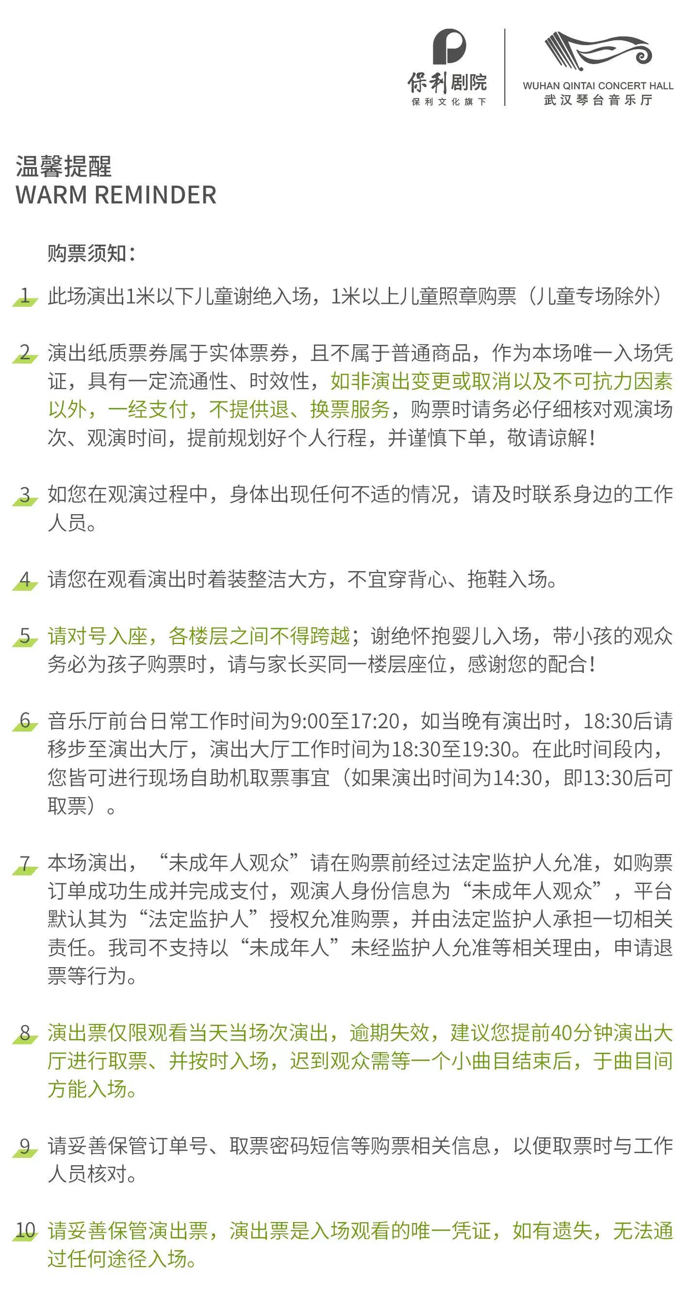 | 重要提示 | 演出现场气氛热烈,请您务必根据自身身体状况酌情是否购票参与观演,特别是患有心脏类疾病、急性心脑血管疾病、心肌炎、高血压等相关疾病的人群,请您务必遵照医嘱,结合病史及个人身体状况进行观演,观演期间请自行承担身体健康相关责任。 | 温馨提示 | 购买前请您提前规划好行程,做好相应准备,以免影响您的正常观演,感谢您的理解和配合。 若演出受不可抗力影响延期或取消,票牛将对演出票订单按照项目官方通知方案进行处理,其他因观演发生的费用需由您自行承担。 |