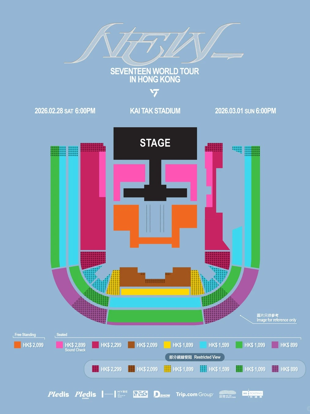 (座位)港币$2,899*、$2,299、$2,099、$1,899、$1,599、$1,099及 $899