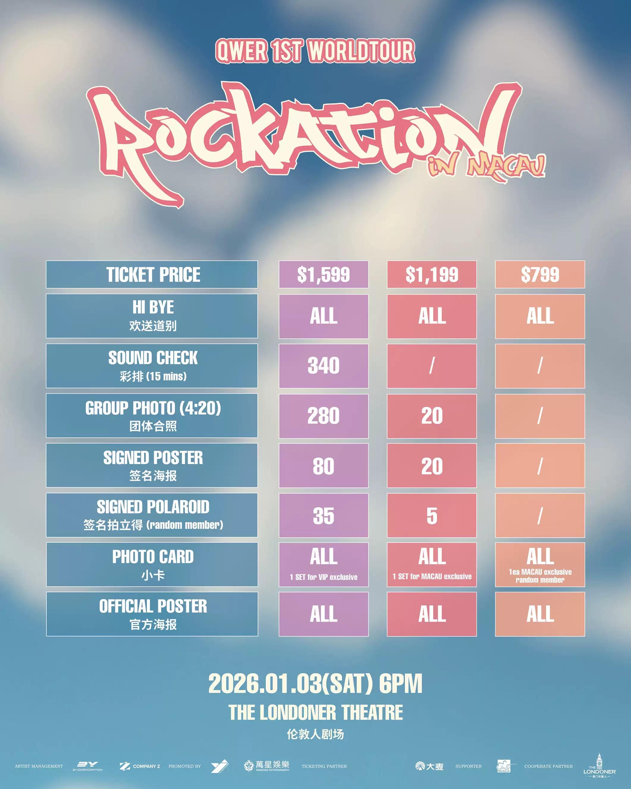 准备迎接激动人心的夜晚!QWER首场世界巡演<ROCKATION>登陆澳门,将以他们独特的摇滚音浪和爆发性的舞台能量点燃全场。不容错过!