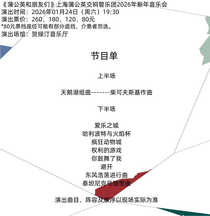 | 禁止携带物品 | 食品、饮料、相机、充电宝、打火机等 | 发票说明 | 如需开具发票,请在演出结束后一个月内联系客服并提供开票信息:票款发票由商家开具,平台服务费发票由票牛开具。 |