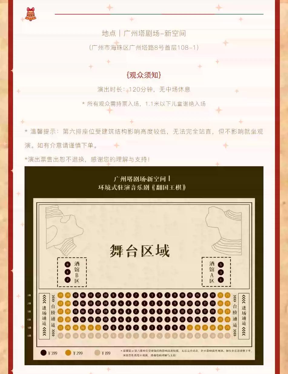 | 座位类型 | 请按门票对应座位,有序对号入座 | 儿童入场提示 | 所有观众需持票入场,1.1米以下儿童谢绝入场 |