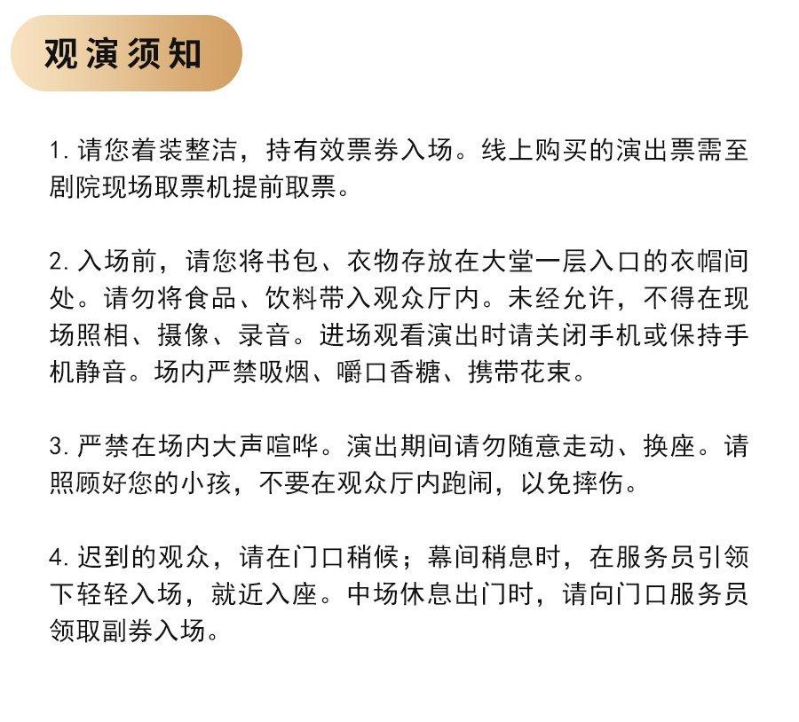 | 禁止携带物品 | 食品、饮料、相机、充电宝、打火机等 | 发票说明 | 如需开具发票,请在演出结束后一个月内联系客服并提供开票信息:票款发票由商家开具,平台服务费发票由票牛开具。 |