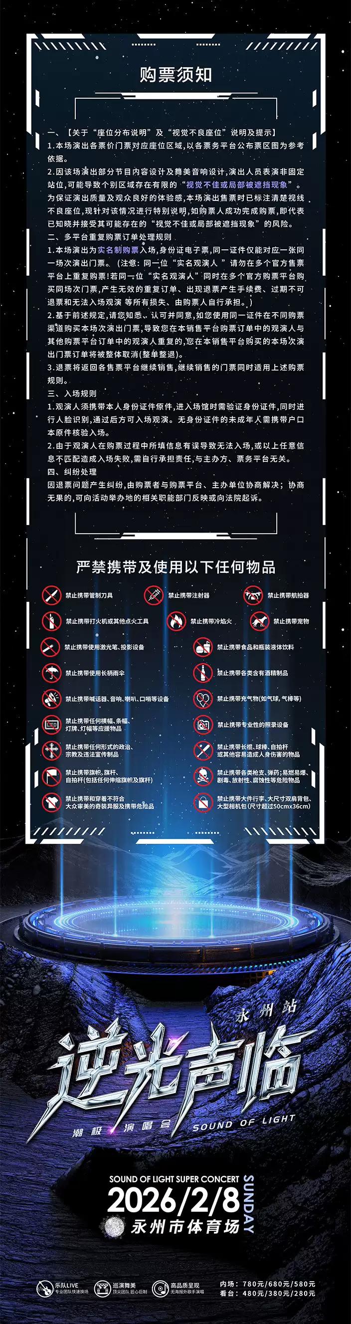 | 限购说明 | 每单限购6张 | 重复购票说明 | 同一位“实名观演人”请勿在多个售票平台重复购票,一位“实名观演人”的身份信息对应同场次的一张门票。 若同一位“实名观演人”被发现存在多个购票平台购买同场次行为,由该行为产生的无效重复订单、退票手续费、过期不可退票、无法入场等所有损失,均由购票人自行承担。 |