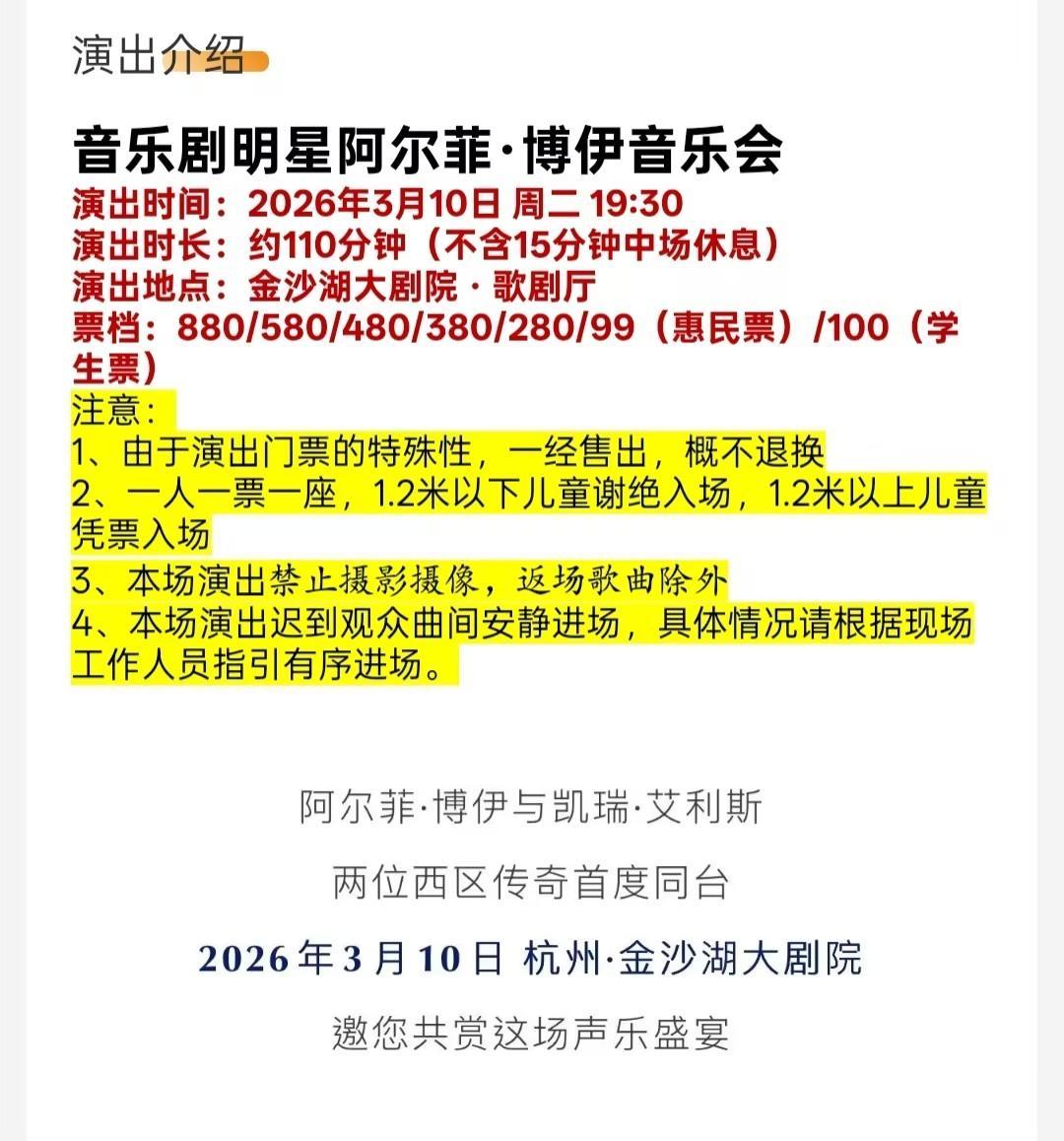 | 限购说明 | 每单限购6张 | 重复购票说明 | 同一位“实名观演人”请勿在多个售票平台重复购票,一位“实名观演人”的身份信息对应同场次的一张门票。 若同一位“实名观演人”被发现存在多个购票平台购买同场次行为,由该行为产生的无效重复订单、退票手续费、过期不可退票、无法入场等所有损失,均由购票人自行承担。 |