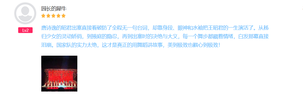 舞剧《昭君出塞》讲述了汉元帝时期,为了保边塞安宁,昭君"请缨赴塞上",终老塞上,完成和亲宁边使命,促成民族和睦的一段佳话历程。舞剧在战争到和平的沿变发展中刻画了昭君在面临无奈与苦楚,各种抉择之间的种种心路,体现了女性在面对"和亲"这一行为时的大义与勇气,从而表现出华夏民族的大爱情怀和家国情怀。