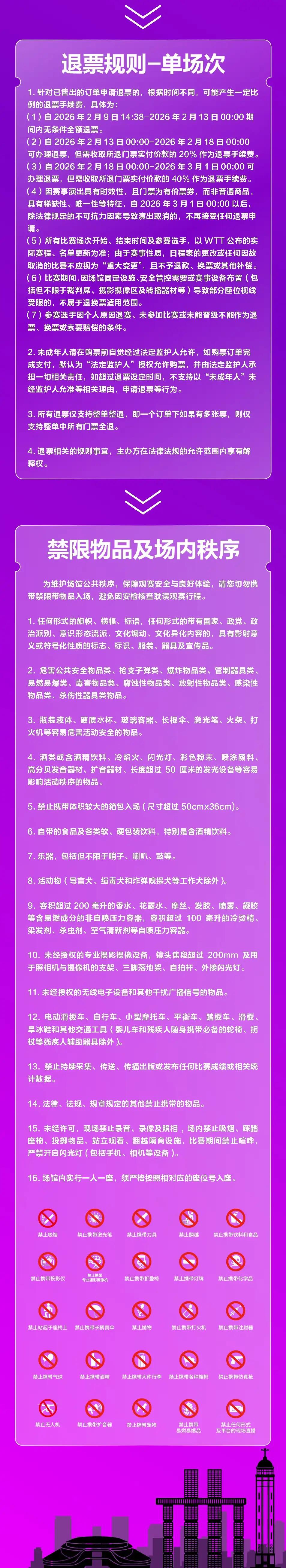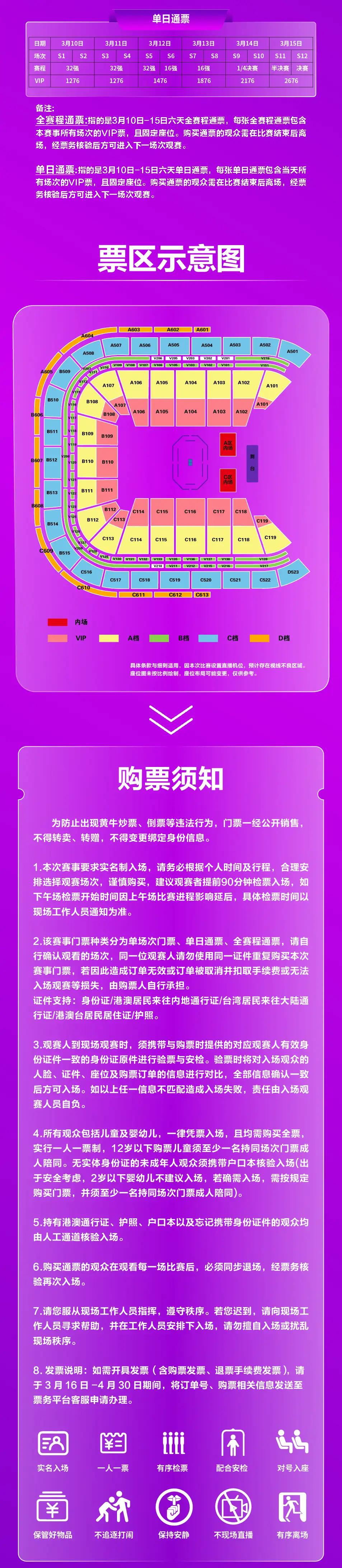 | 限购说明 | 每单限购6张 | 重复购票说明 | 同一位“实名观演人”请勿在多个售票平台重复购票,一位“实名观演人”的身份信息对应同场次的一张门票。 若同一位“实名观演人”被发现存在多个购票平台购买同场次行为,由该行为产生的无效重复订单、退票手续费、过期不可退票、无法入场等所有损失,均由购票人自行承担。 |