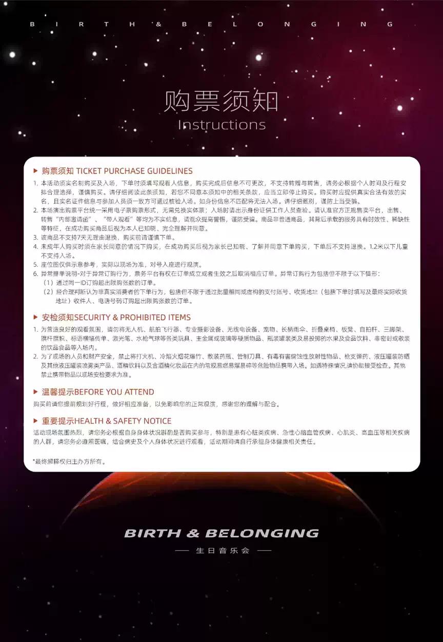 | 发票说明 | 如需开具发票,请在演出结束后一个月内联系客服并提供开票信息:票款发票由商家开具,平台服务费发票由票牛开具。 | 重要提示 | 演出现场气氛热烈,请您务必根据自身身体状况酌情是否购票参与观演,特别是患有心脏类疾病、急性心脑血管疾病、心肌炎、高血压等相关疾病的人群,请您务必遵照医嘱,结合病史及个人身体状况进行观演,观演期间请自行承担身体健康相关责任。 |