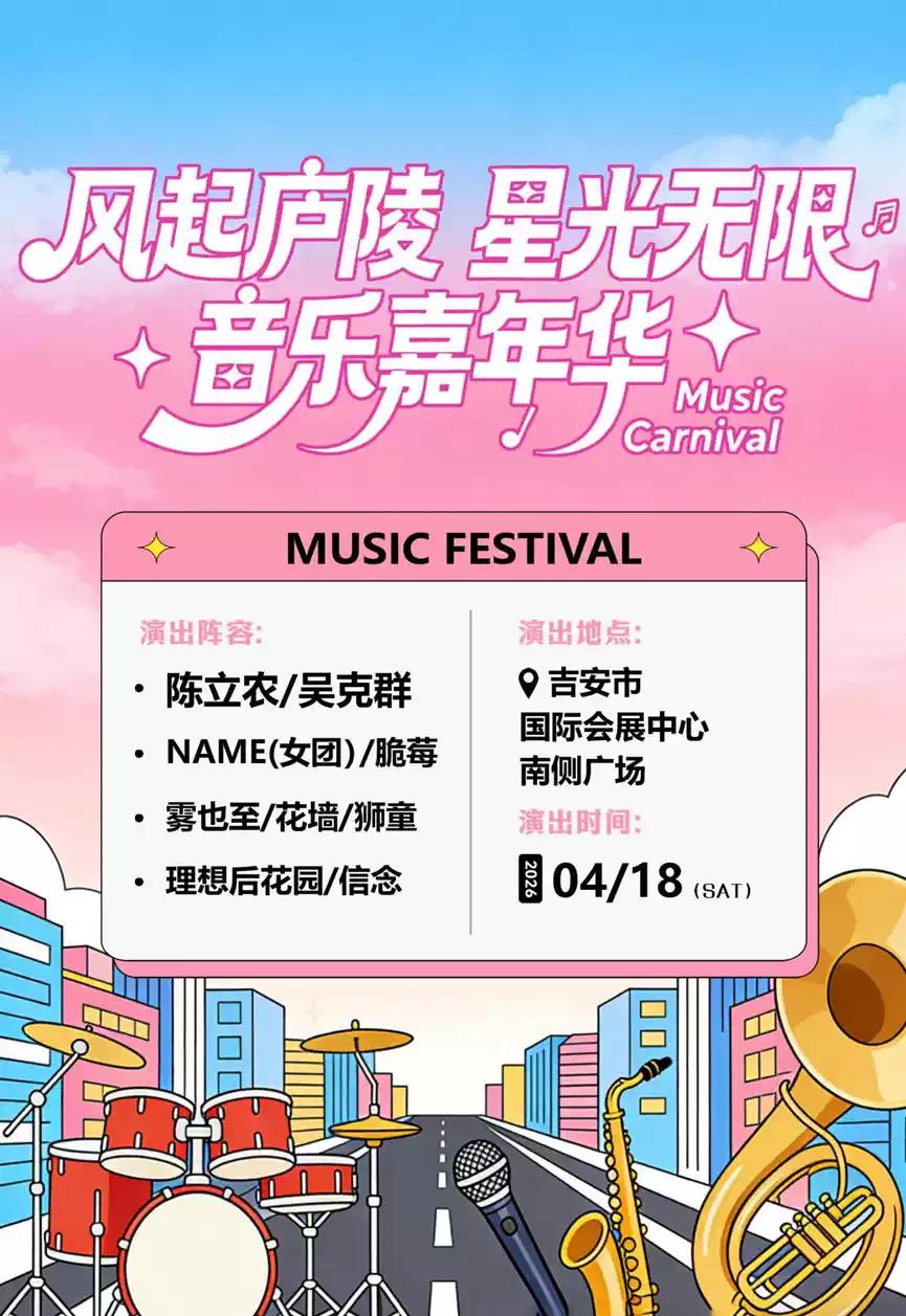 江西吉安拥有得天独厚的自然环境,自古以来就有吉山秀水美如画,庐陵风华耀千年的历史文化城市;吉安将为音乐嘉年华营造出绝 佳的氛围。届时,观众们不仅能欣赏到精彩绝伦的演出,还能在红色诞生地尽情享受音乐带来的快乐。 风起庐陵星光无限音乐嘉年华,这不仅是一场音乐的聚会,更是一次心灵的交融。无论是热爱流行音乐的你,还是钟情于摇滚的乐迷,都能在这里找到属于自己的音乐天 堂。让我们共同期待4月18日的到来,在吉安国际会展中心南侧广场,与心仪的艺人一起,用音乐点燃这个夏天!准备好尖叫与欢呼,一起迎接这场震撼人心的音乐盛宴吧!敬请期待!