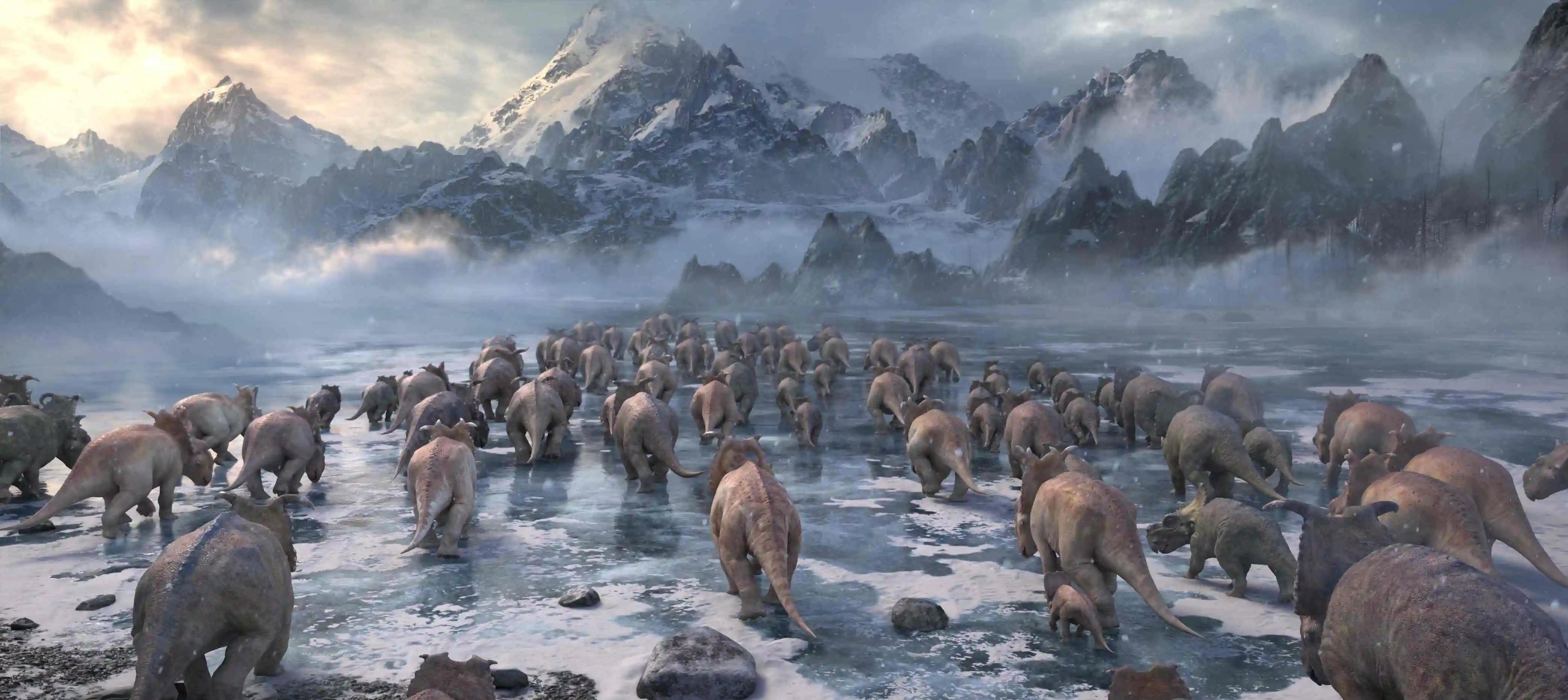 当银幕亮起,观众将穿越 6500 万年前的时空屏障,沉浸式踏入白垩纪的莽荒世界。镜头如隐形观察者般聚焦于一群顶着独特骨褶鼻冠的厚鼻龙,它们如同身披天然铠甲的绿色军团,在广袤的史前大陆上书写着繁衍迁徙的生命史诗。